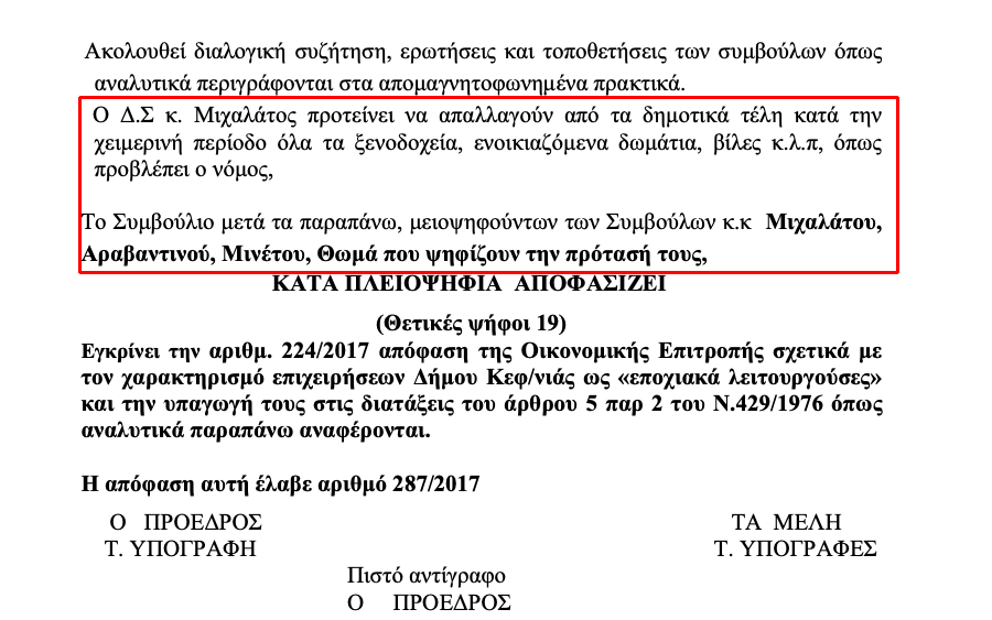 Άμεση ήταν η αντίδραση της «Ομάδας διαστρέβλωσης» της ΙΣΧΥΡΗΣ ΚΕΦΑΛΟΝΙΑΣ του Αλέξανδρου Παρίση, όπου βρίσκονταν στο τιμόνι του Δήμου για 9 συναπτά έτη, η οποία με ένα κρεσέντο λαϊκισμού επιχείρησε να κάνει το μαύρο – άσπρο , στρεφόμενη εναντίον της δέσμευσης Μιχαλάτου. Η αλήθεια είναι όμως ότι η θέση του Θεόφιλου για τα δημοτικά τέλη είναι διαχρονική, έχει εκφραστεί στο δημόσιο διάλογο πολλές φορές κατά το παρελθόν, όπως κατά το 2017… Τότε σε σχετική συζήτηση στο δημοτικό συμβούλιο, ως επικεφαλής της αντιπολίτευσης μειοψηφούσε προτείνοντας να απαλλαγούν από τα δημοτικά τέλη κατά τη χειμερινή περίοδο όλα τα ενοικιαζόμενα δωμάτια , ξενοδοχεία, βίλες. Για του λόγου το αληθές το σχετικό απόσπασμα από τα πρακτικά.