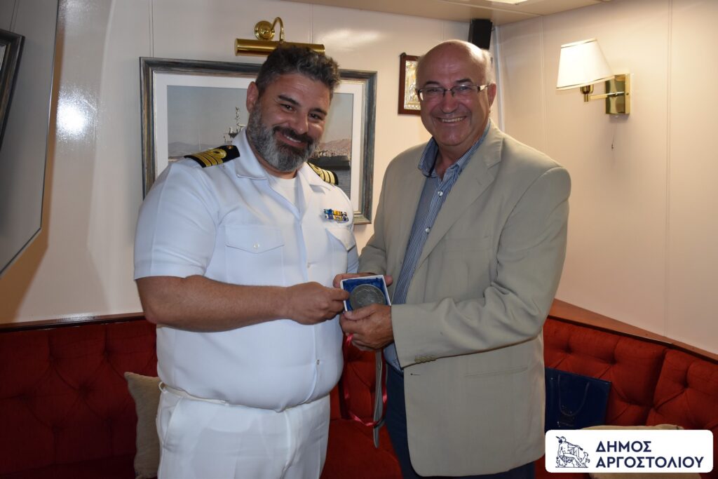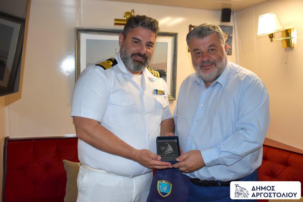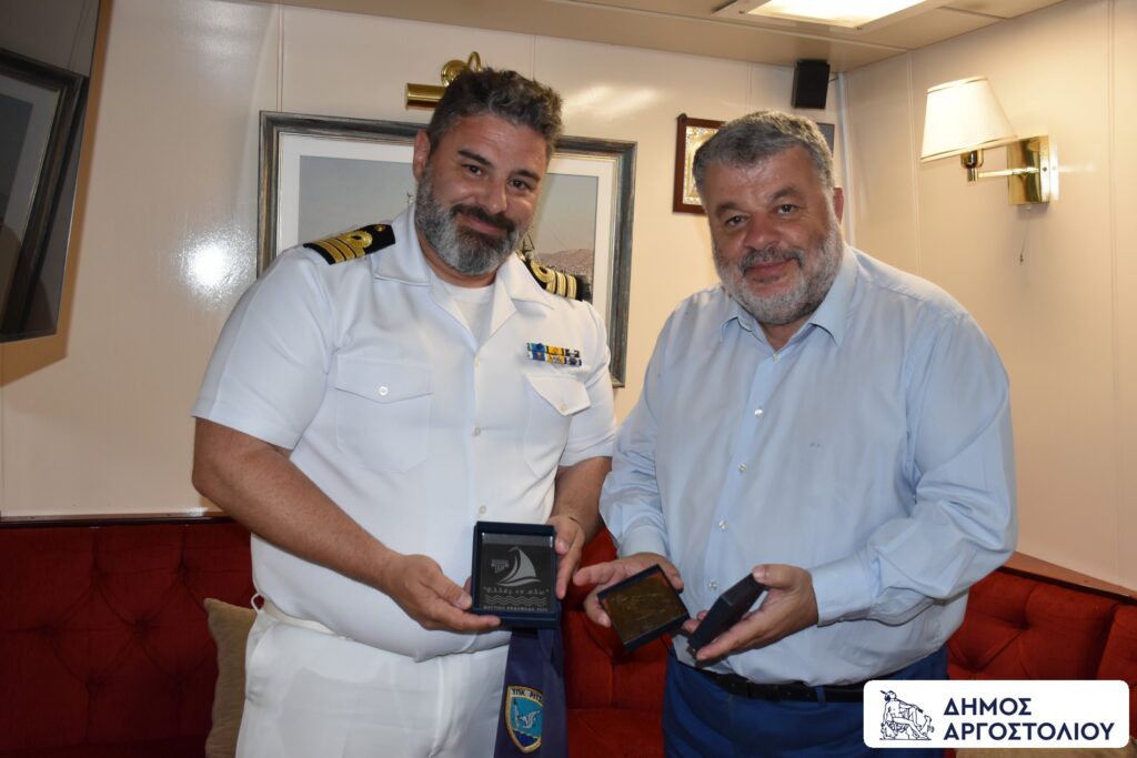 Εκφράζοντας την βαθιά εκτίμηση και ευγνωμοσύνη του για την πολύτιμη και ακούραστη προσφορά του Πολεμικού Ναυτικού, ο Δήμαρχος Αργοστολίου, παρέδωσε αναμνηστικά δώρα, στον Κυβερνήτη του πλοίου, Πλωτάρχη του ΠΝ κ. Ιωάννη Τσιμπουξή, ο οποίος υποδέχθηκε θερμά την αντιπροσωπεία της Κεφαλονιάς, παρέδωσε ως αναμνηστικό το έμβλημα της ‘’Ναυτικής Εβδομάδας 2025’’ και μίλησε με τα καλύτερα λόγια για το νησί μας.