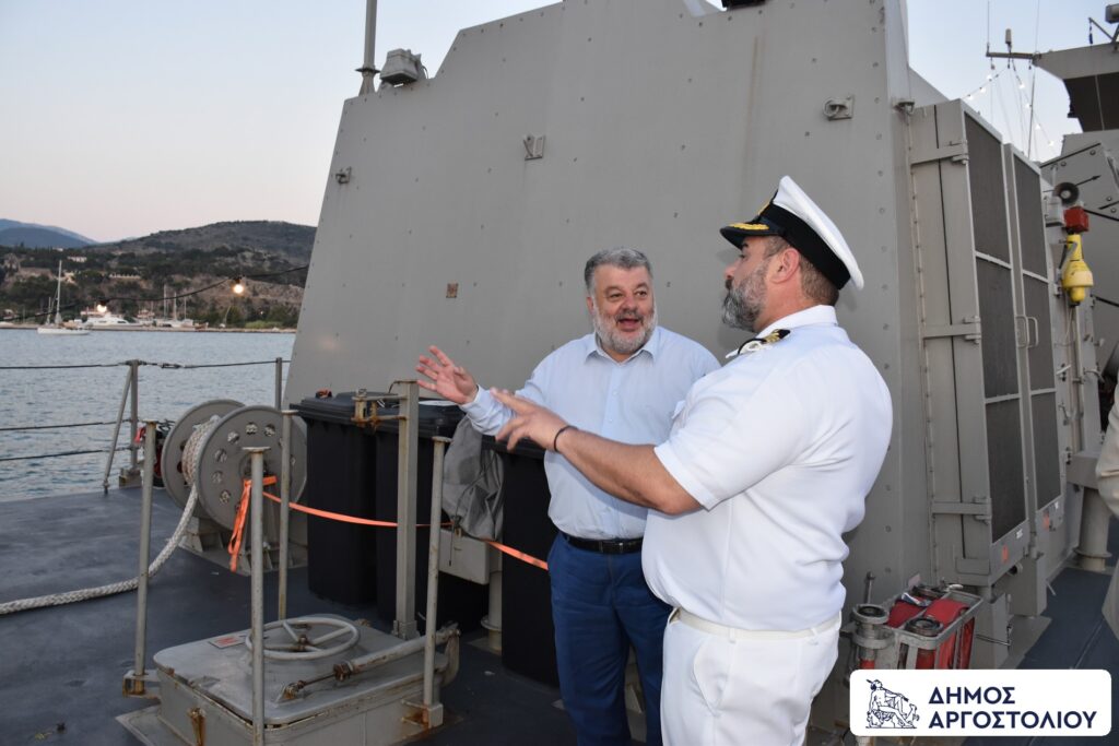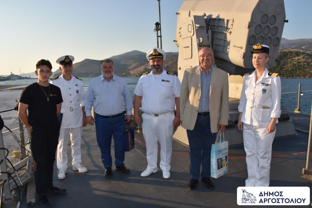 Ο Δήμαρχος Αργοστολίου, μαζί με τον Αντιπεριφερειάρχη κ. Σωτήρη Κουρή, την Λιμενάρχη Κεφαλονιάς Αντιπλοίαρχο Λ.Σ. κα Ανθούλα Νταβάκου και τον Υπολιμενάρχη Κεφαλονιάς Υποπλοίαρχο κ. Πιέρρο Τζαμαρία, ξεναγήθηκαν στους χώρους του πολεμικού πλοίου.