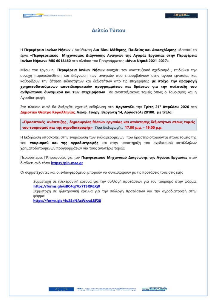 Εκδήλωση την Τρίτη 21 Απριλίου “Προοπτικές ανάπτυξης, δημιουργίας θέσεων εργασίας και απόκτησης δεξιοτήτων” στον Κέφαλο