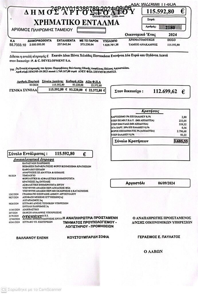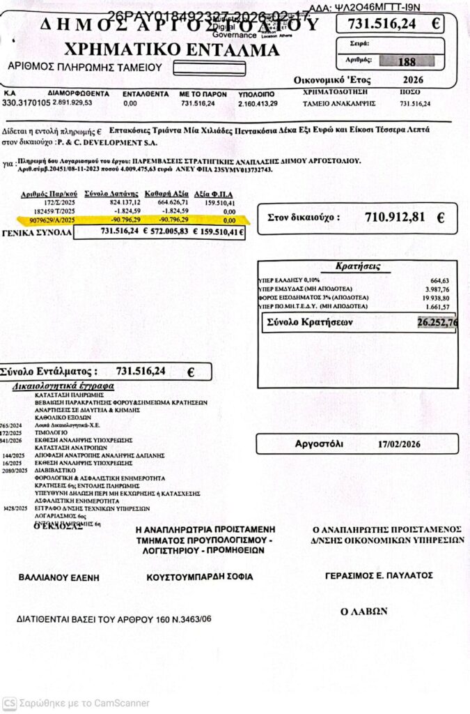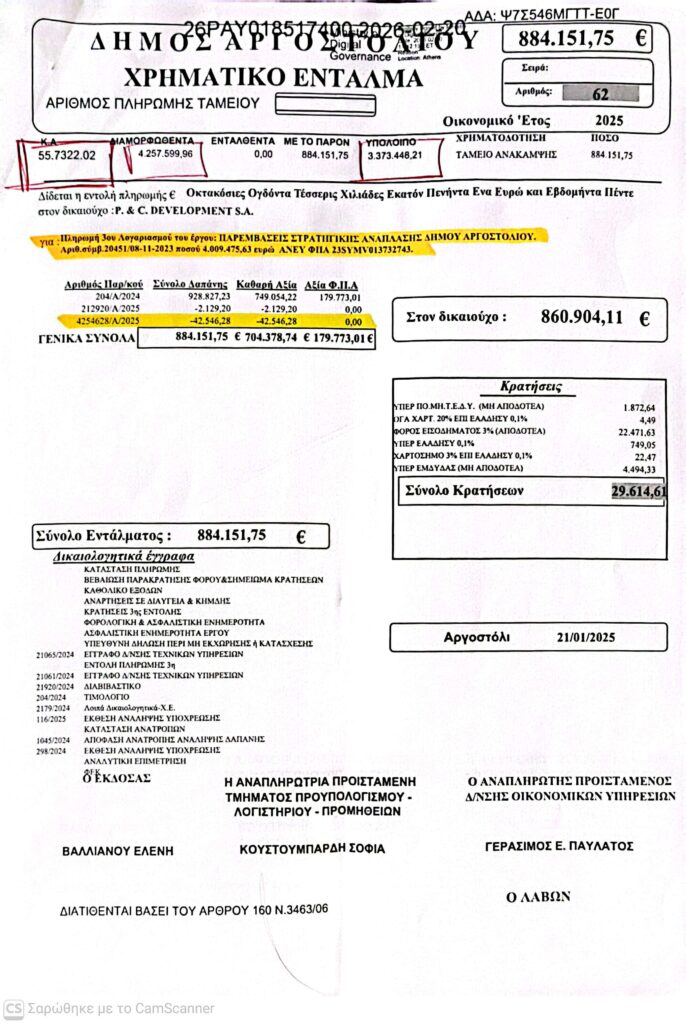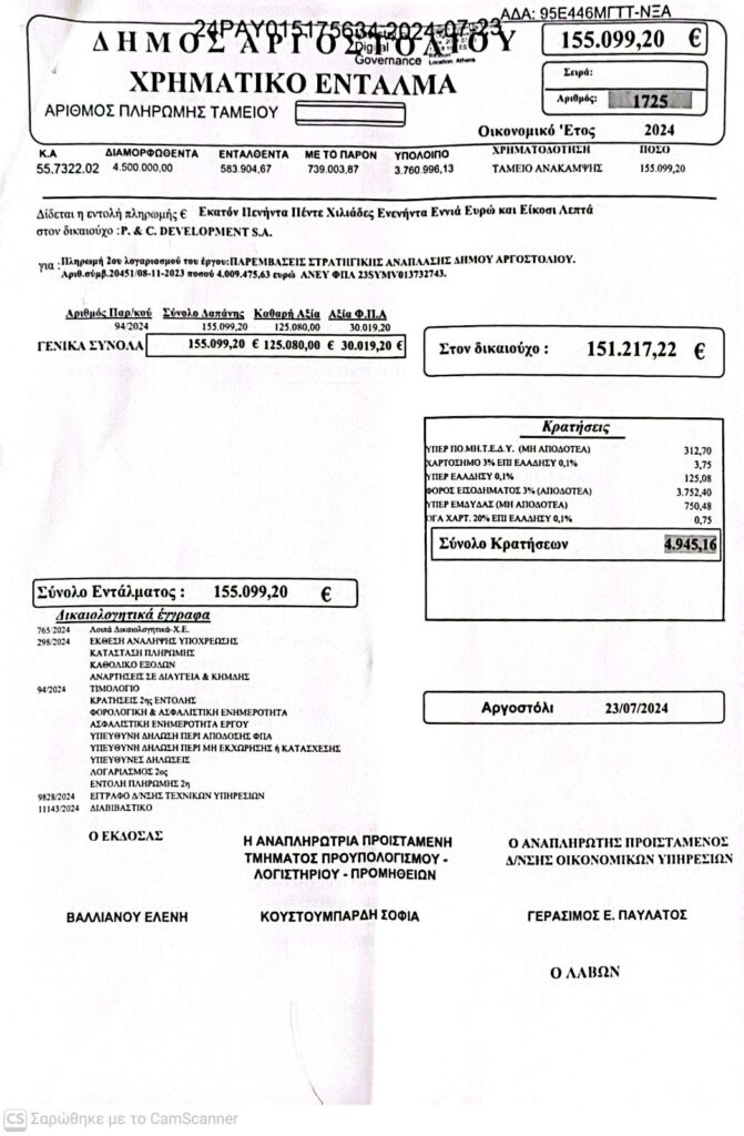 Ωστόσο, στο ίδιο ένταλμα αναγράφεται κανονικά ο σωστός κωδικός έργου 55.7322.02 που αντιστοιχεί στο έργο ‘’Παρεμβάσεις Στρατηγικής Ανάπλασης Δήμου Αργοστολίου’’.
