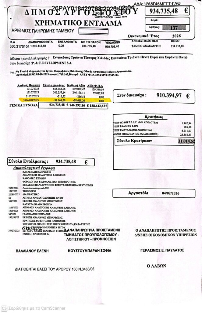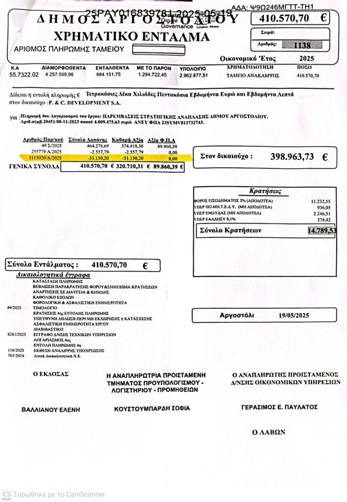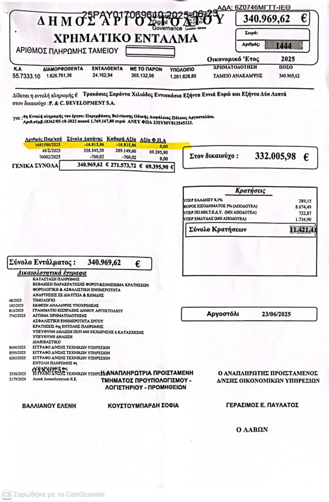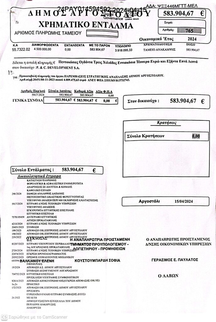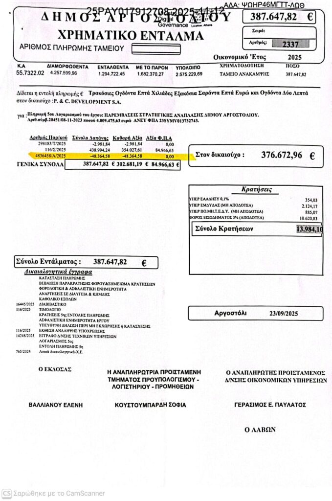 Ωστόσο, στο ίδιο ένταλμα αναγράφεται κανονικά ο σωστός κωδικός έργου 55.7322.02 που αντιστοιχεί στο έργο ‘’Παρεμβάσεις Στρατηγικής Ανάπλασης Δήμου Αργοστολίου’’.