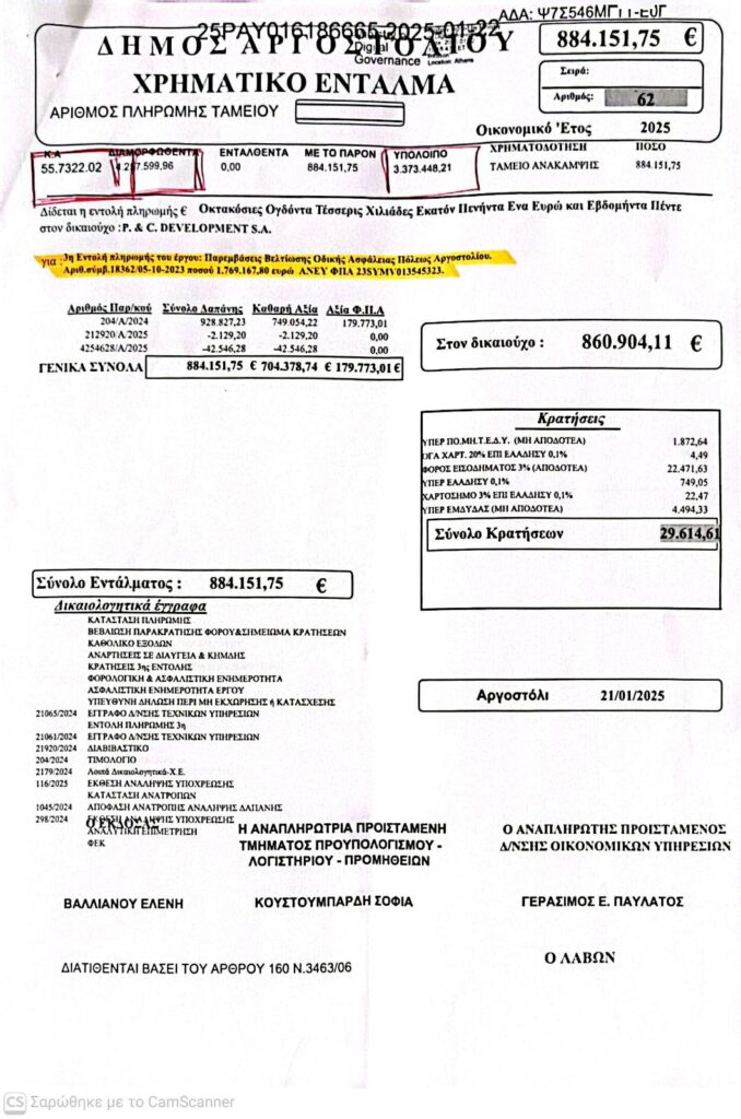 Γ. Στις 21/01/2025 με το χρηματικό ένταλμα 62/2025 καταβλήθηκε ποσό 884.151,75 € που αφορά την 3η πληρωμή.