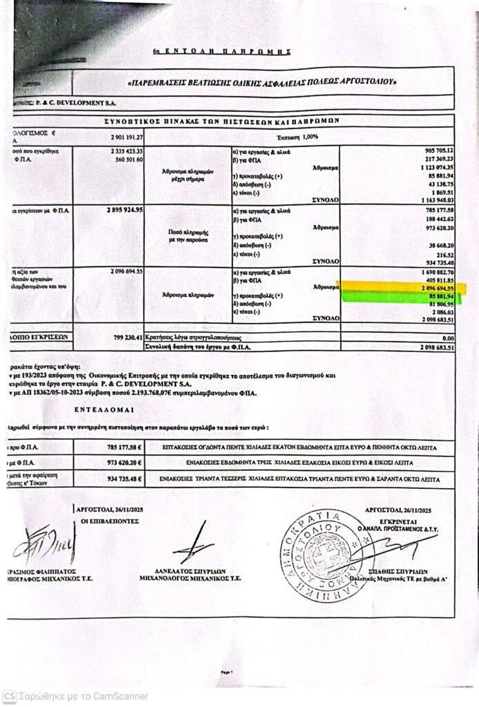 Κατά συνέπεια οι λογαριασμοί του έργου βελτίωσης Οδικής Ασφάλειας Πόλεως Αργοστολίου, ανέρχονται στο ποσό των 2.096.694,55€ από το οποίο έχει παρακρατηθεί ποσό 85.881,94€ λόγω της από 06/09/2024 χορηγηθείσας προκαταβολής. Μέχρι και την τελική εξόφληση του έργου θα έχει αποσβεστεί πλήρως η προκαταβολή που πήρε ο ανάδοχος με το χρηματικό ένταλμα 2179/2024.