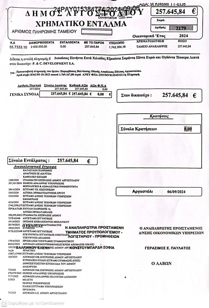 Α. Στις 06/09/2024 με το χρηματικό ένταλμα 2179/2024 καταβλήθηκε ποσό 257.645,84€ που αφορά προκαταβολή και 1η πληρωμή.