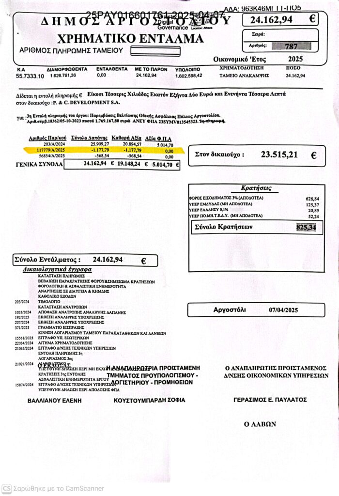 Γ. Στις 07/04/2025 με το χρηματικό ένταλμα 787/2025 καταβλήθηκε ποσό 24.162,94 € που αφορά την 3η πληρωμή. Το αρχικό ποσό της 3ης πληρωμής, είναι 25.909,27€, από αυτό λόγω της από 06/09/2024 χορηγηθείσας προκαταβολής δόθηκε 24.162,94€