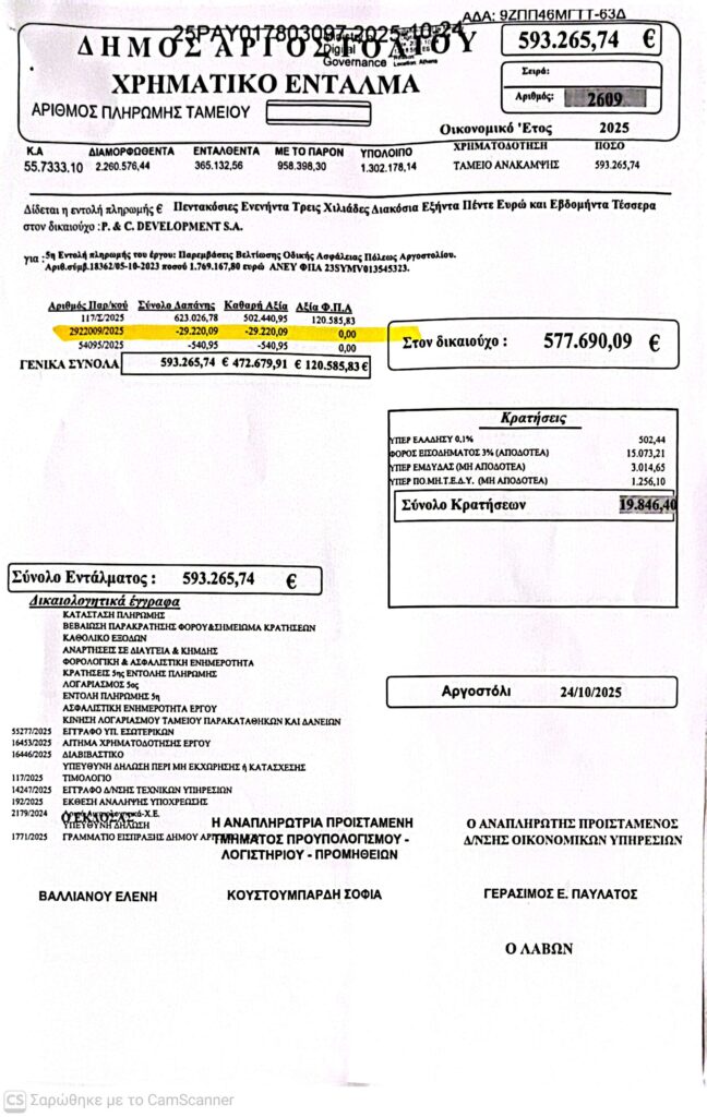 Ε. Στις 24/10/2025 με το χρηματικό ένταλμα 2609/2025 καταβλήθηκε ποσό 593.265,74 € που αφορά την 5η πληρωμή. Το αρχικό ποσό της 5ης πληρωμής, είναι 623.026,78€, από αυτό λόγω της από 06/09/2024 χορηγηθείσας προκαταβολής δόθηκε 593.265,74€.