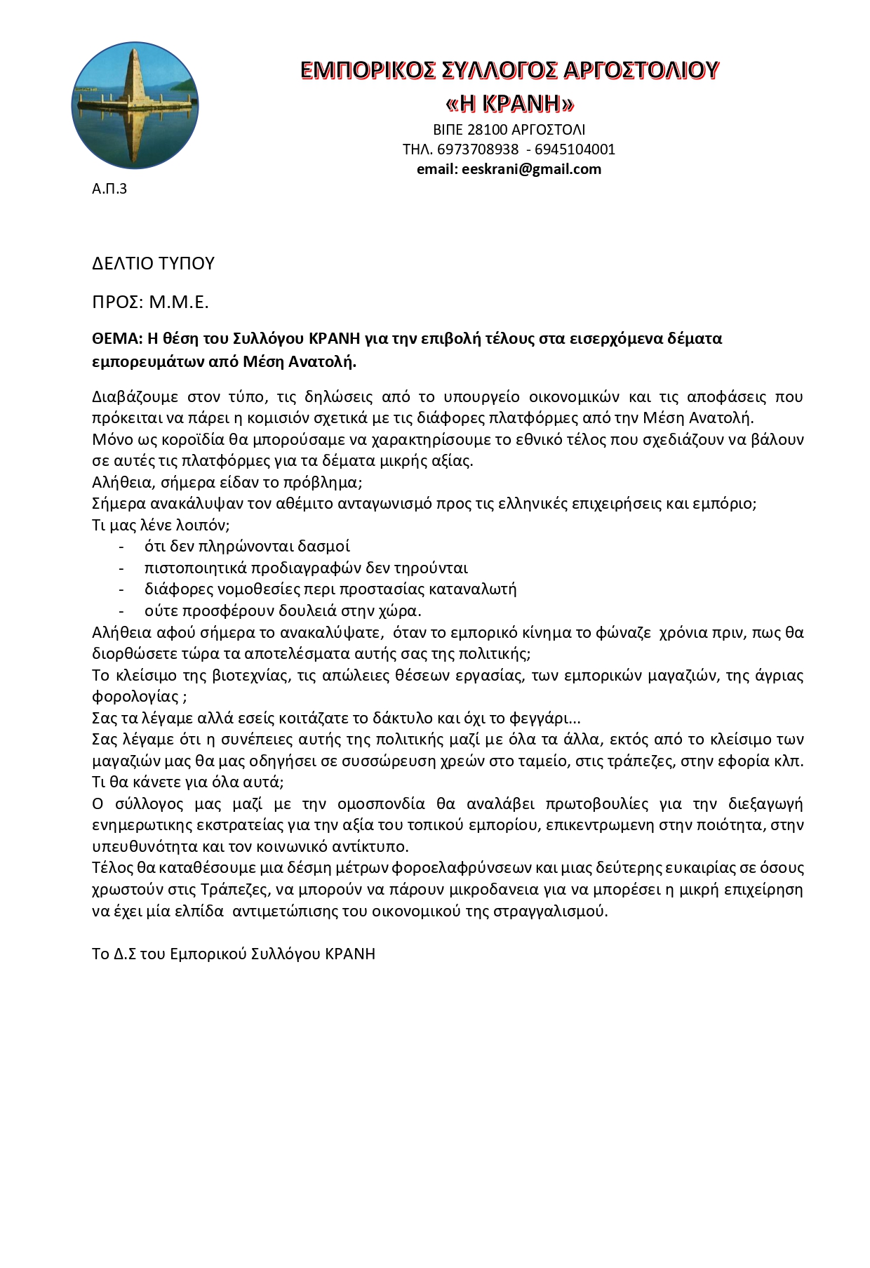 Η θέση του Εμπορικού Συλλόγου “Η Κράνη” για την επιβολή τέλους στα δέματα εμπορευμάτων από Μέση Ανατολή