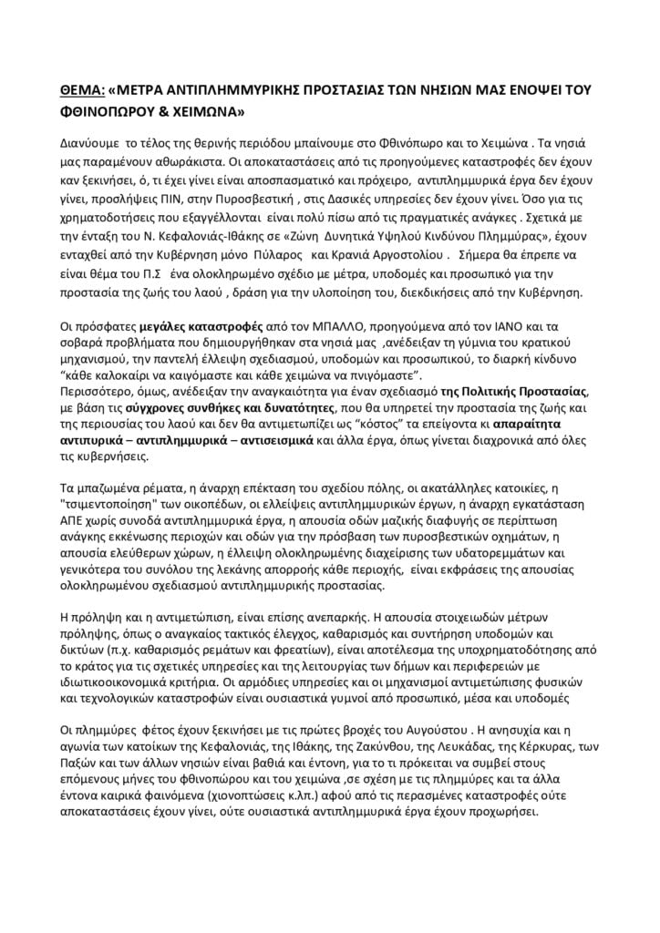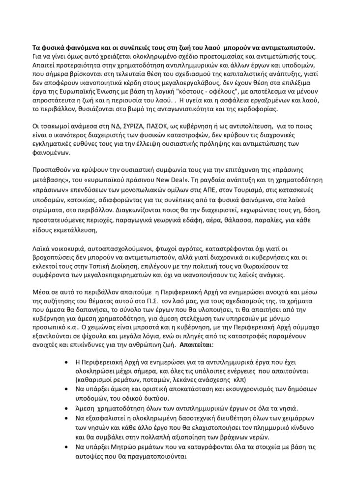 η Λαϊκή Συσπείρωση, κατέθεσε εισήγηση με θέμα: “Μέτρα αντιπλημμυρικής προστασίας των νησιών μας, εν όψει του Φθινοπώρου και του Χειμώνα”