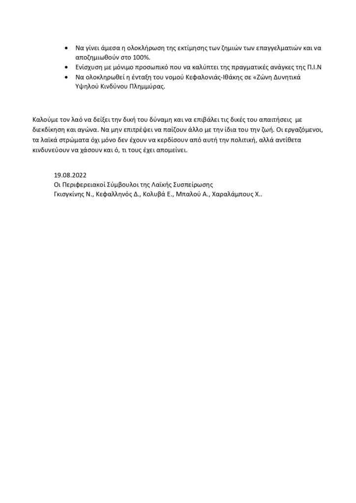 Στην συνεδρίαση του Π.Σ. στις 27 & 28  Αυγούστου 2022, η Λαϊκή Συσπείρωση, κατέθεσε εισήγηση με το Ε.Η.Δ. θέμα: “Μέτρα αντιπλημμυρικής προστασίας των νησιών μας, εν όψει του Φθινοπώρου και του Χειμώνα”, προκειμένου να συζητηθεί, θεωρώντας το ως σοβαρό και επείγον ζήτημα.