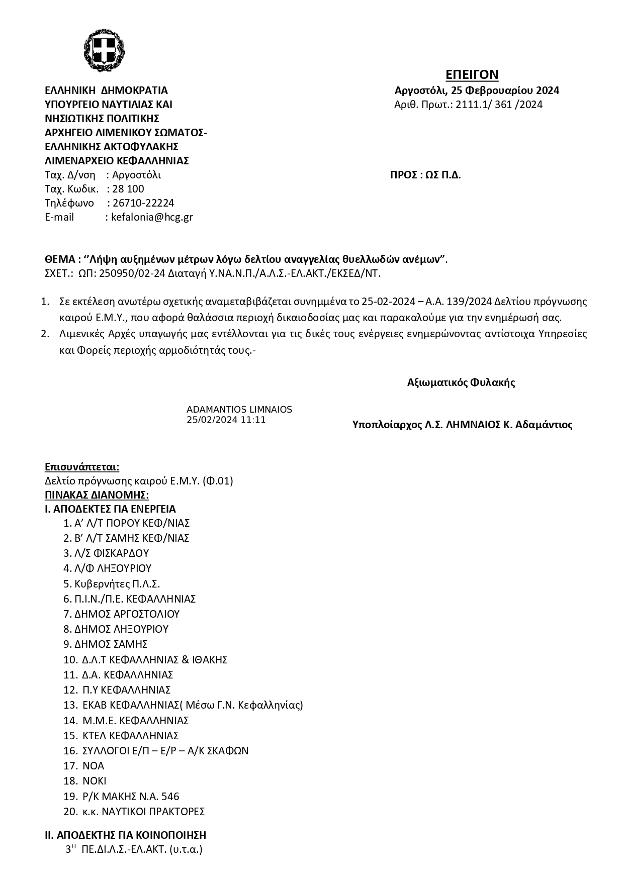 Λήψη μέτρων λόγω αναγγελίας θυελλωδών ανέμων