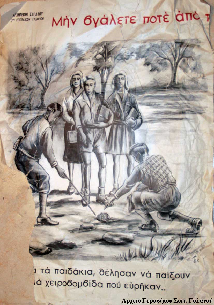 Πόσοι άνθρωποι, ιδίως νέοι, βρήκαν άσχημο θάνατο ή έμειναν ανάπηροι από αυτά τα «δώρα» που μας άφησε ο πόλεμος. Η αφίσα δυστυχώς είναι ταλαιπωρημένη και δε σώζεται ολόκληρη, αλλά παρέχει το ενημερωτικό μήνυμα για την προστασία των παιδιών, που την περιέργεια, το παιχνίδι και την όμορφη νεανική ανεμυαλιά τους, πλήρωναν με το χάσιμο της ζωής τους ή το σωματικό τραύμα που τους συνόδευε για πάντα, καθώς «περιεργάζονταν» το παίγνιο του θανάτου, τη χειροβομβίδα.