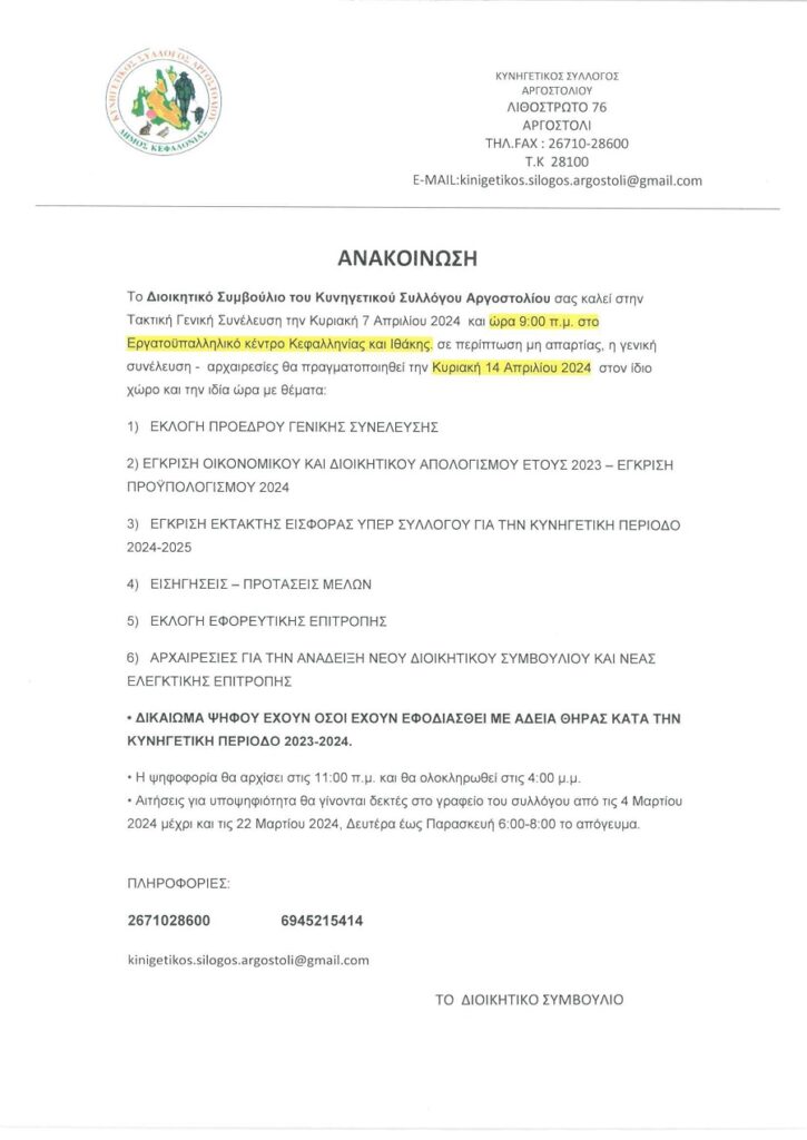Ο Κυνηγετικός Σύλλογος Αργοστολίου καλεί τα μέλη του σε Γενική Συνέλευση την Κυριακή 7 Απριλίου
