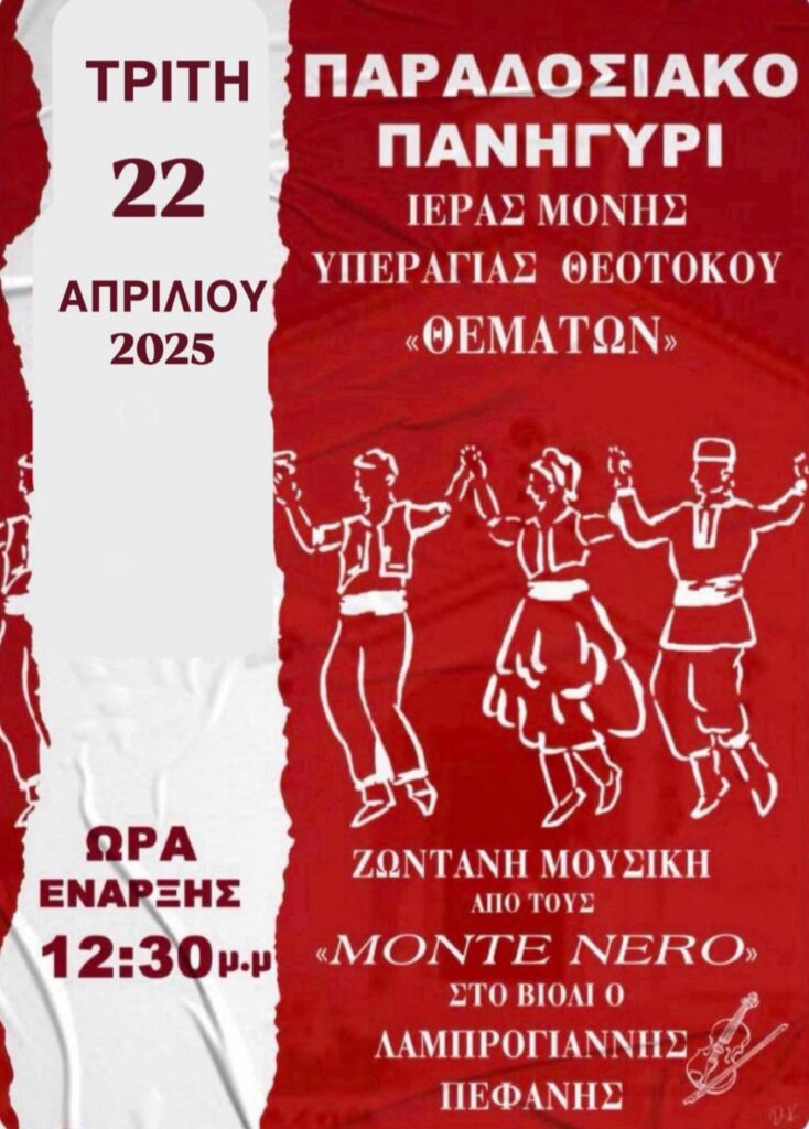 Την Τρίτη 22 Απριλίου 2025 γιορτάζει και πανηγυρίζει η Ιερά Μονή Υπεραγίας Θεοτόκου Θεμάτων, η οποία θα είναι ανοικτή για όλους τους προσκυνητές και επισκέπτες.