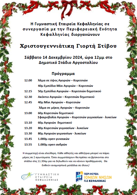 Χριστουγεννιάτικη Γιορτή Στίβου το Σάββατο 14 Δεκεμβρίου στο Δημοτικό Στάδιο Αργοστολίου