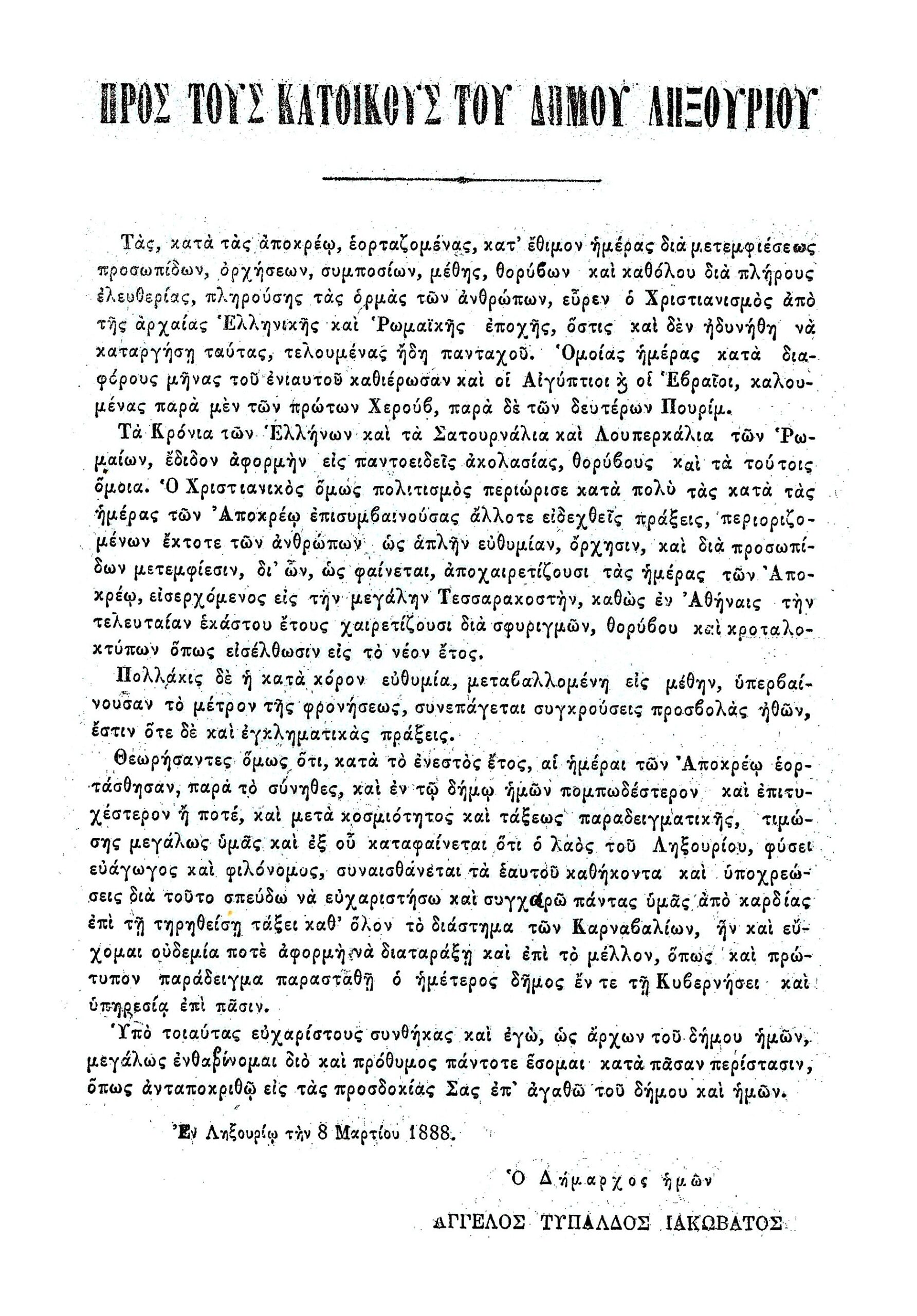 Υπάρχουν ιστορικές αναφορές για όλη αυτή τη διονυσιακή αποκριά στη Χωροπούλα του Λασκαράτου, με βασική αυτή: το μονόφυλλο του τότε Δημάρχου,  Άγγελου Τυπάλδου  Ιακωβάτου, ο οποίος γνωρίζοντας πως το καρναβάλι στο Ληξούρι έχει οργιαστικό μπρίο και  ακράτητο κέφι, έκδωσε ένα μονόφυλλο στα 1888, για να προλάβει τους Ληξουριώτες, να περιορίσουν τα έντονο καρναβαλικό ταρνανάι και να μην κάνουν ζημιές και καταστροφές στην πόλη τους,  πάνω στα ρωμαϊκά ξεφαντώματα της αποκριάς τους,  που τα είχαν από παράδοση αιώνων.