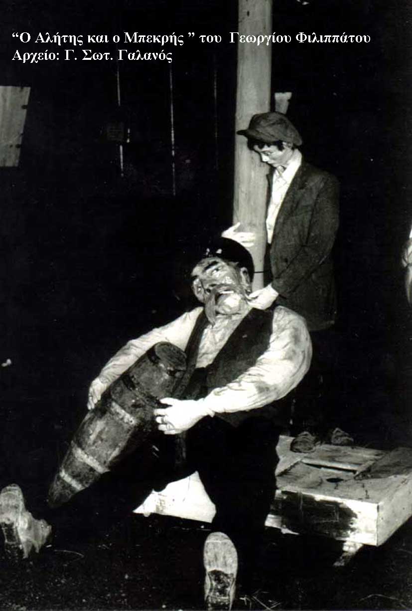«Ο αλήτης  και ο μπεκρής». Σε μια γωνία  δρόμου καθισμένος και ακουμπισμένος σε κολόνα ένας  μπεκρής, έχοντας στο πλάι του μια σκίτσα κρασί, έδειχνε να βρίσκεται χαμένος και πιωμένος έως το μεδούλι. Ένας αλήτης με το χαρακτηριστικό καπέλο του ήταν κοντά του, με το ένα χέρι αγκαλιάζει την κολόνα  και με τ’ άλλο τραβά το μουστάκι του μπεκρή. Τα πρόσωπα ήταν από κερί και οι «παγωμένες» τους γκριμάτσες εκφραστικότατες, σμιλευμένες από τον Γιώργο  Φιλιππάτο. Η κατασκευή αυτή δεν παρουσιάστηκε, λόγω αντιδράσεων,  που πείσμωσαν τον ίδιο τον κατασκευαστή.