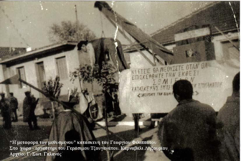 Είναι δε για τους νεότερους μάθημα, για το πώς πρέπει να είναι επιμελημένα και δουλεμένα τα άρματα και τα θέματα στο καρναβάλι. Παρόμοιο θέμα  ήταν «Ο μεθυσμένος», που τόν μεταφέρουν στο σπίτι του με ένα γερανό. Το άρμα αυτό παρουσιάστηκε στο καρναβάλι και άφησε καλές εντυπώσεις. Ήταν κι αυτό κατασκευασμένο στο εργοστάσιο του Γεράσιμου Τζουγανάτου. Μελετημένο, απλό και παραστατικό, από τα καλλιτεχνικά  χέρια του  Γιώργου Φιλιππάτου.
