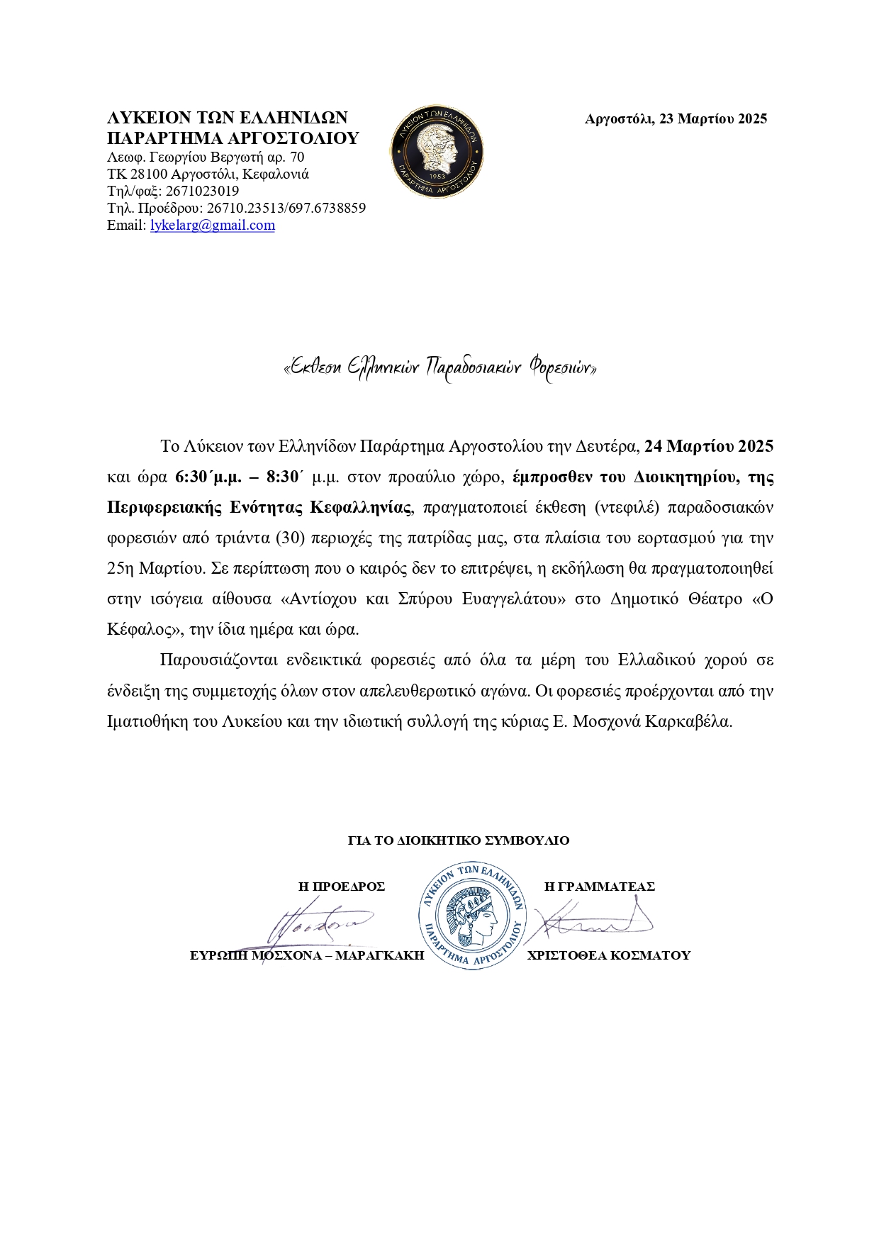 Έκθεση Ελληνικών παραδοσιακών φορεσιών σήμερα μπροστά από την Περιφερειακή Ενότητα Κεφαλληνίας