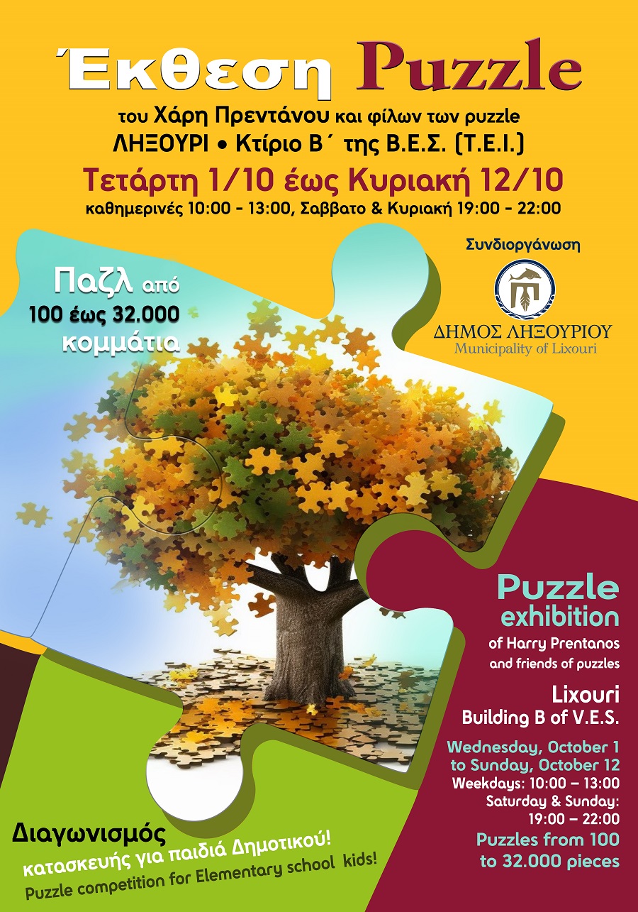 Ο Δήμος Ληξουρίου και ο Χάρης Πρεντάνος σας προσκαλούν στην έκθεση παζλ που θα φιλοξενηθεί στο Κτίριο Β’ της Βαλλιανείου Επαγγελματικής Σχολής, από την Τετάρτη 1 Οκτωβρίου έως και την Κυριακή 12 Οκτωβρίου 2025.