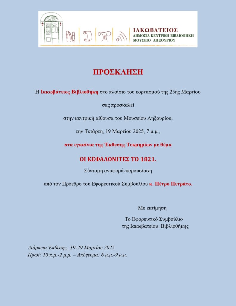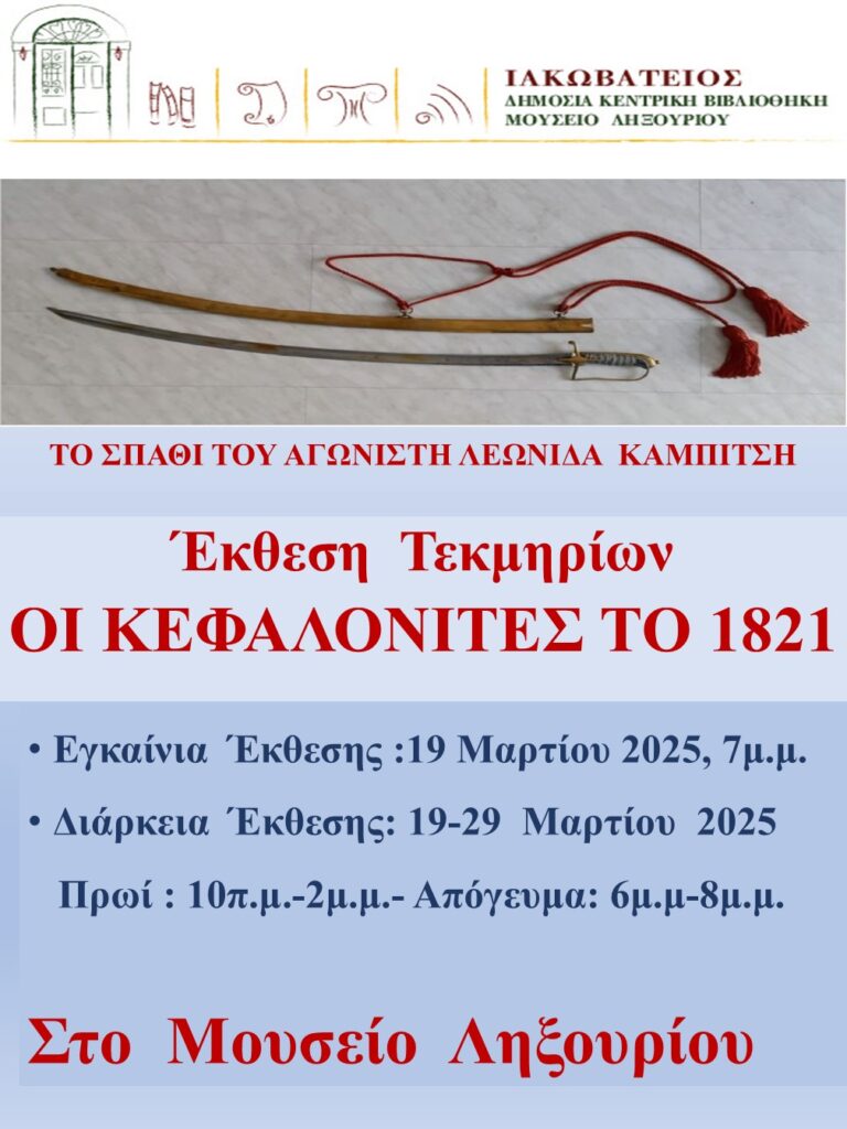 Η Ιακωβάτειος Βιβλιοθήκη, στο πλαίσιο του εορτασμού της 25ης Μαρτίου, διοργανώνει στην κεντρική αίθουσα του Μουσείου Ληξουρίου Έκθεση τεκμηρίων με θέμα «Οι Κεφαλονίτες το 1821».