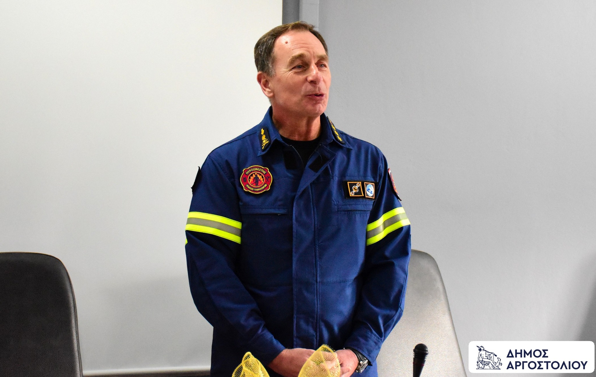 Ο αντιδήμαρχος Πολιτικής Προστασίας του Δήμου κ. Διονύσης Κωνσταντάτος, στον χαιρετισμό του, εξήρε το έργο της Πυροσβεστικής Υπηρεσίας Κεφαλονιάς και του ίδιου του διοικητή του Νομού, τονίζοντας ότι στόχος του Δήμου Αργοστολίου, μέσω της Πολιτικής Προστασίας, είναι να βρίσκεται στο πλευρό των Πυροσβεστικών δυνάμεων του νησιού, για ένα όσο το δυνατόν καλύτερο αποτέλεσμα, όπου και όποτε χρειαστεί.