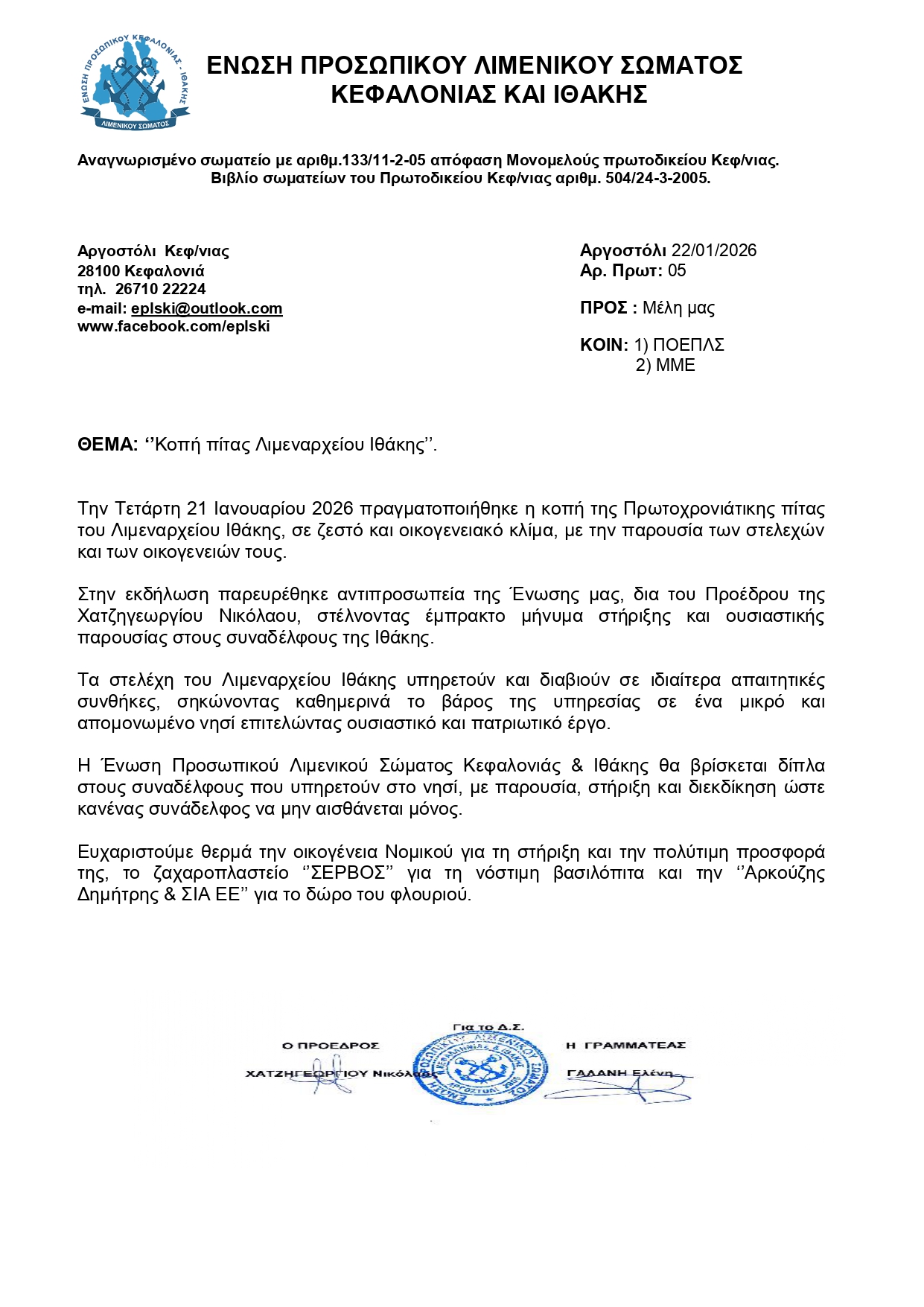 Έκοψε την πρωτοχρονιάτικη πίτα του το Λιμεναρχείο Ιθάκης