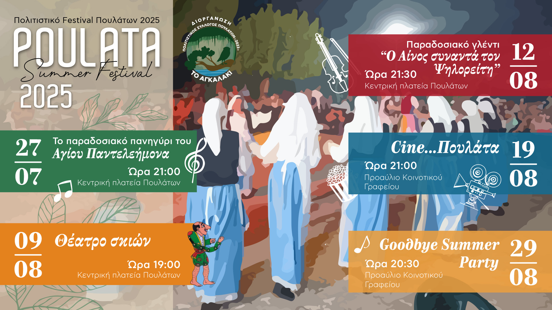Το δεύτερο “Poulata Summer Festival” είναι γεγονός! Ειδικότερα, ο Πολιτιστικός Σύλλογος «Το Αγκαλάκι» για δεύτερη συνεχή χρονιά έχει προγραμματίσει μία σειρά εκδηλώσεων, που στόχο έχουν να διασκεδάσουν τους κατοίκους και τους επισκέπτες των Πουλάτων, με τρόπο που μόνο ο πολιτισμός με την ευρύτερη έννοιά του μπορεί!