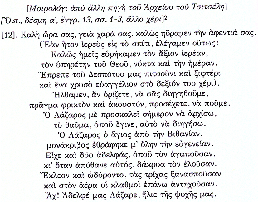 λαζαρικά κάλαντα που είχε καταγράψει ο ιστοριοδίφης Ηλίας Α. Τσιτσέλης και έχουν