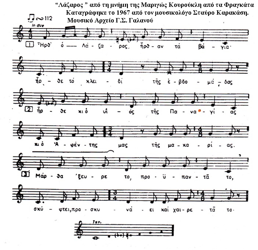 Ακολουθεί επίσης ένας «Λάζαρος» τραγουδημένος από τη Μαριγώ Κουρούκλη ετών 72,από τα Φραγκάτα το 1967. Στην αρχικά δημοσίευση και έκδοση του άσματος, λέει ο μελετητής- καταγραφέας πως «ο σκοπός είναι παλιός και σήμερα έχει αντικατασταθεί με νεότερο που τον μαθαίνουν τα παιδιά στο σχολείο» και ότι «η μελωδία του ανήκει εις τον τρόπον του do, αντίστοιχον του Δ΄ δημοτικού ήχου της Εκκλησιαστικής μουσικής, με χαρακτηριστική κατάληξιν εις την πέμπτην, καλύπτει δε εις 6 μέτρα των 4/8 δυο δισύλλαβους στίχους.