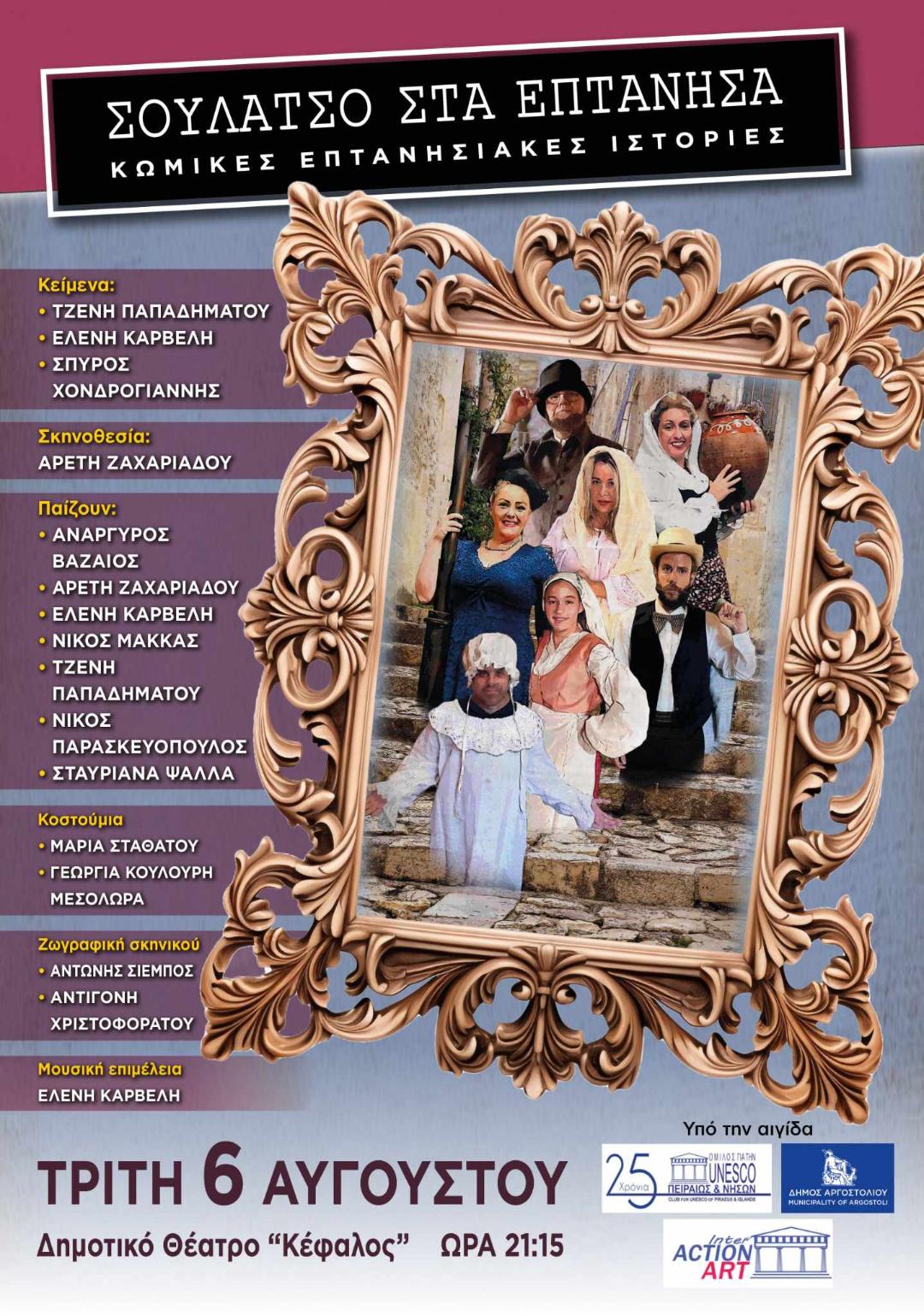 - Η Θεατρική παράσταση «ΣΟΥΛΑΤΣΟ στα ΕΠΤΑΝΗΣΑ» μεταφέρεται για την Τρίτη 6 Αυγούστου στις 21.15 στο Δημοτικό Θέατρο «ΚΕΦΑΛΟΣ».