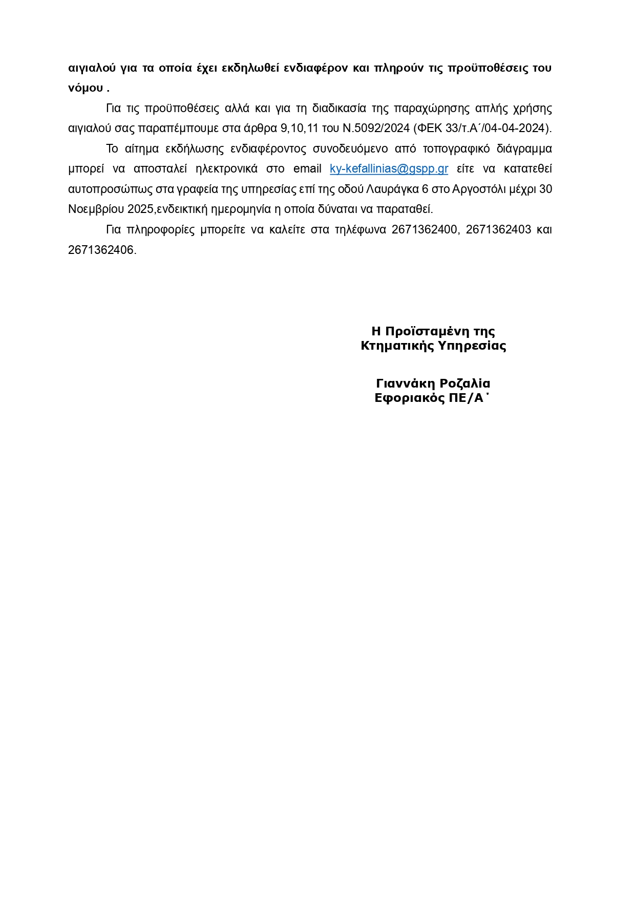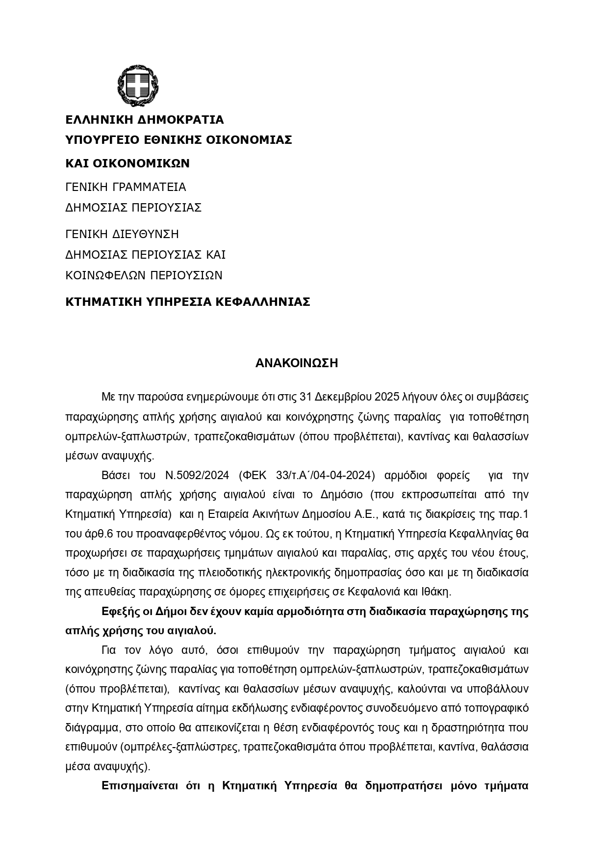 Ανακοίνωση Κτηματικής Υπηρεσίας για τις συμβάσεις αιγιαλού και παραλίας