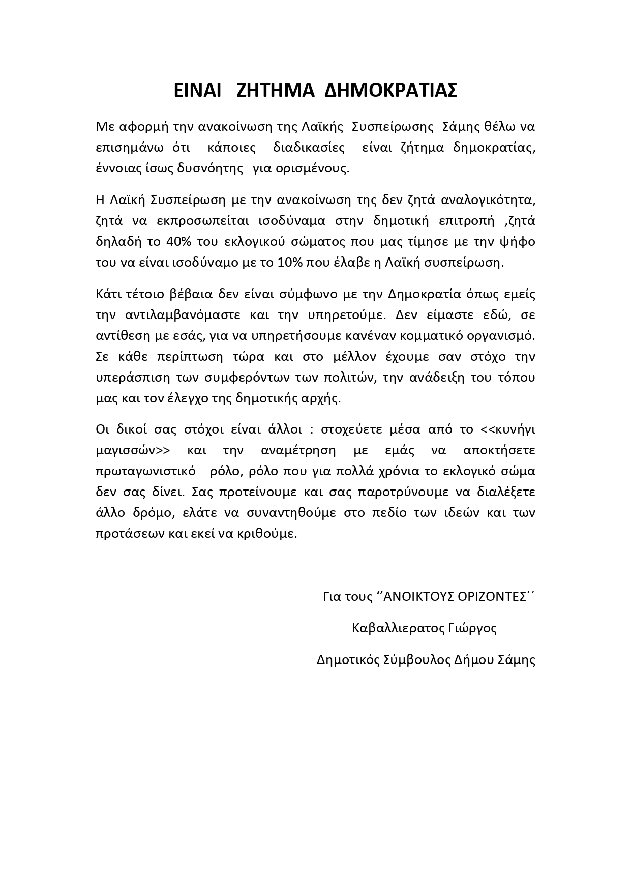 Ανακοίνωση της παράταξης “Ανοιχτοί Ορίζοντες” Δήμου Σάμης