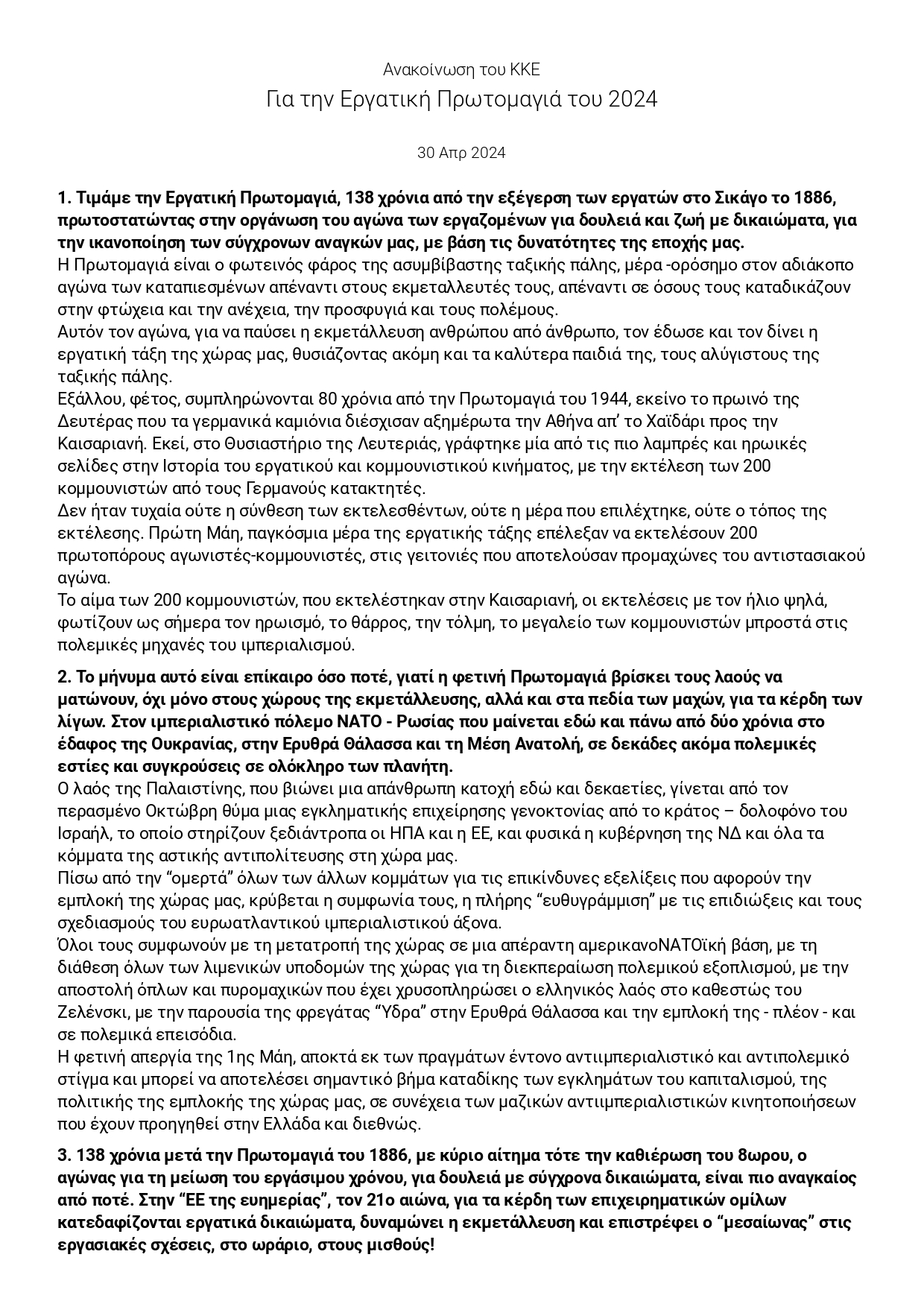 Ανακοίνωση του ΚΚΕ για την Εργατική Πρωτομαγιά του 2024