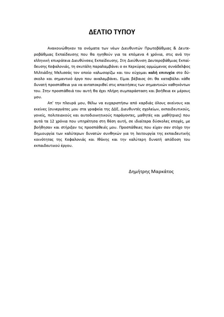 Ανακοινώθηκαν τα ονόματα των νέων Διευθυντών Πρωτοβάθμιας και Δευτεροβάθμιας Εκπαίδευσης-Ευχαριστήρια επιστολή του Δημήτρη Μαρκάτου