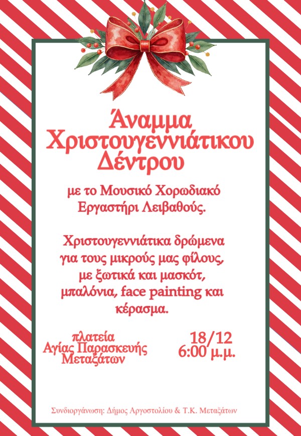 Στα Μεταξάτα, στην πλατεία Αγίας Παρασκευής ώρα: 6.00μμ, Άναμμα Δέντρου με το Παιδικό-Νεανικό Χορωδιακό Εργαστήρι Λειβαθούς.