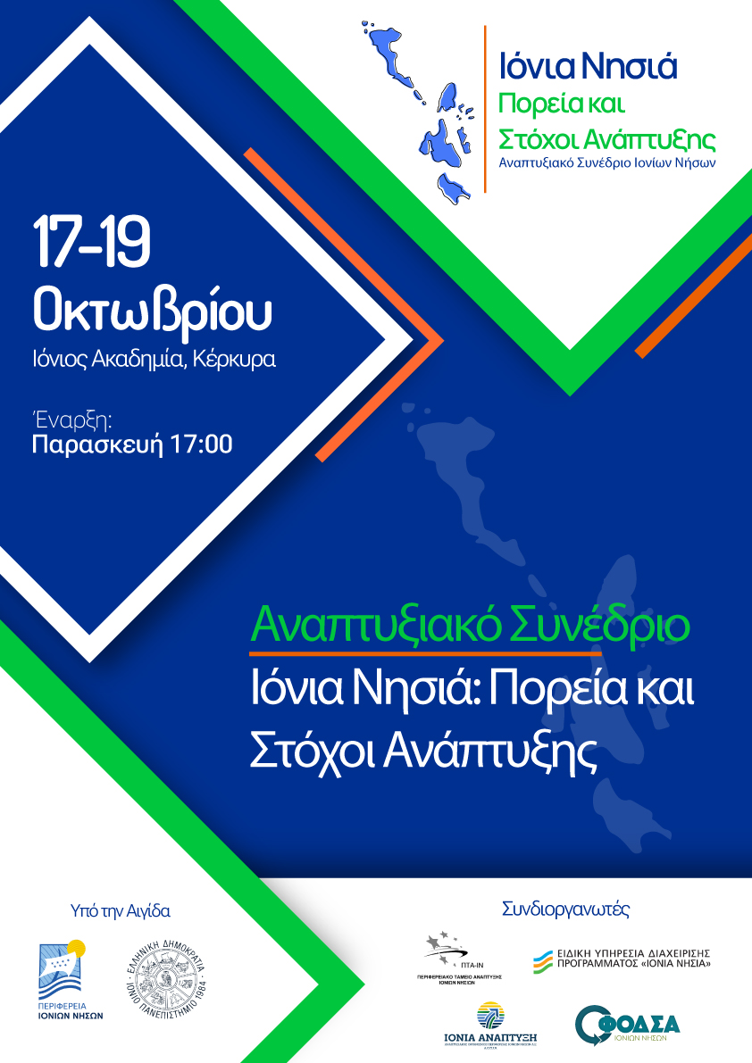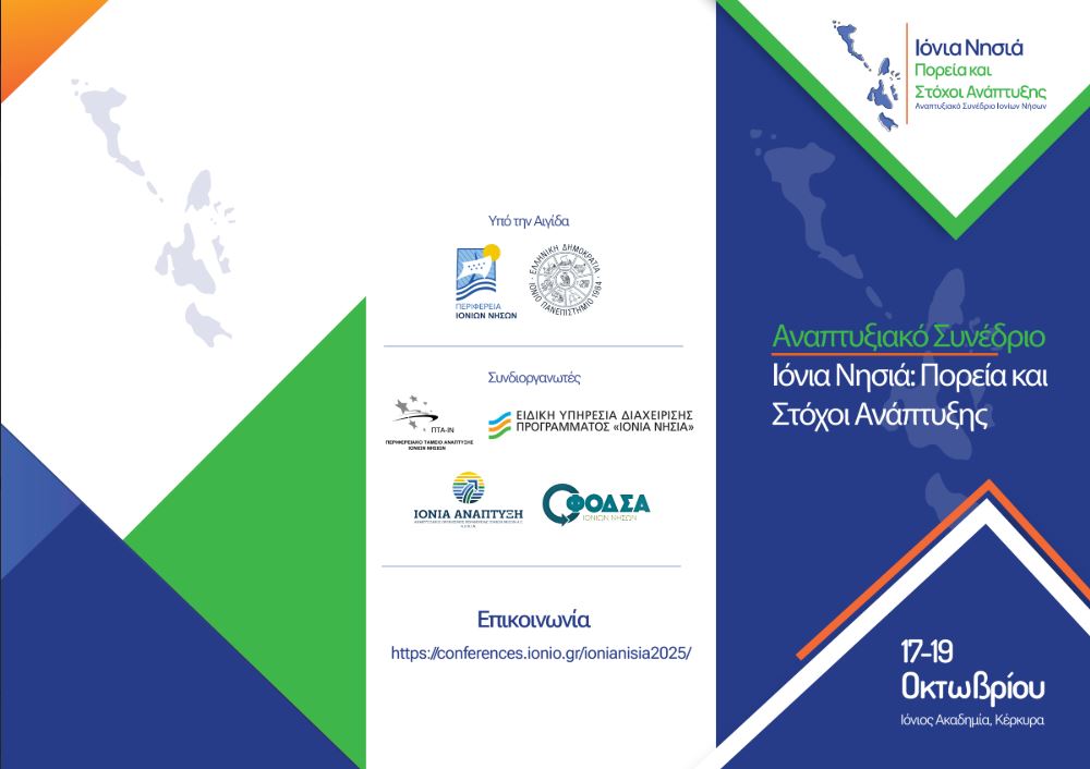 Η Περιφέρεια Ιονίων Νήσων, σε συνεργασία με το Ιόνιο Πανεπιστήμιο και την υποστήριξη του Περιφερειακού Ταμείου Ανάπτυξης και τους θεσμικούς και παραγωγικούς φορείς της περιοχής, διοργανώνει το Αναπτυξιακό Συνέδριο Ιονίων Νήσων με τίτλο «Ιόνια Νησιά: Πορεία και Στόχοι Ανάπτυξης», από την Παρασκευή 17 έως και την Κυριακή 19 Οκτωβρίου 2025, στο ιστορικό κτήριο της Ιονίου Ακαδημίας στην Κέρκυρα.