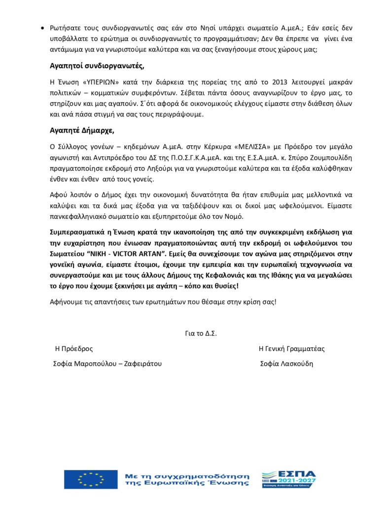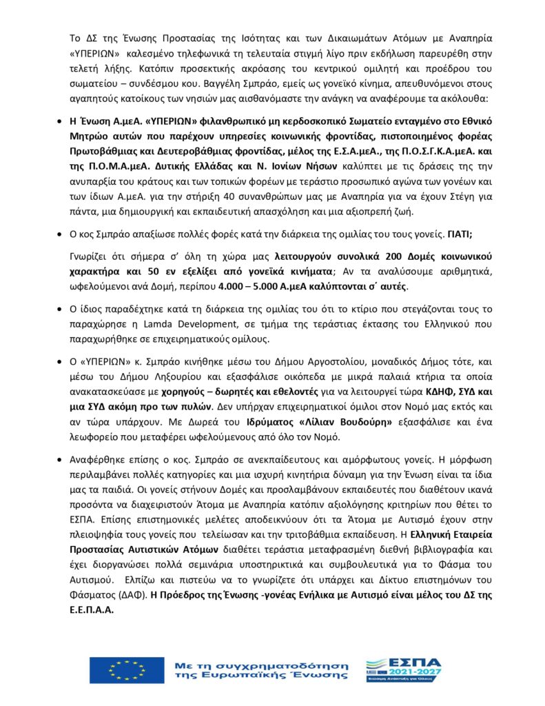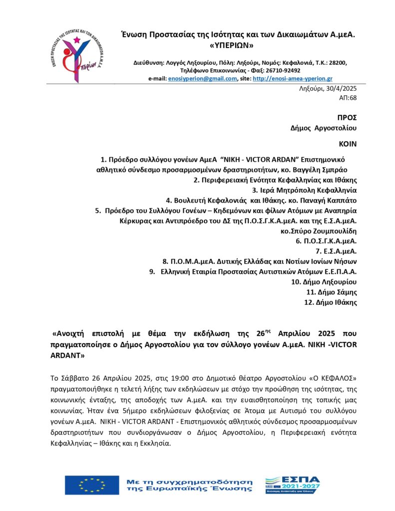 Ανοιχτή επιστολή του Υπερίωνα με θέμα την εκδήλωση της 26ης Απριλίου 2025 που πραγματοποίησε ο Δήμος Αργοστολίου για τον σύλλογο γονέων Α.μεΑ. ΝΙΚΗ -VICTOR ARDANT»