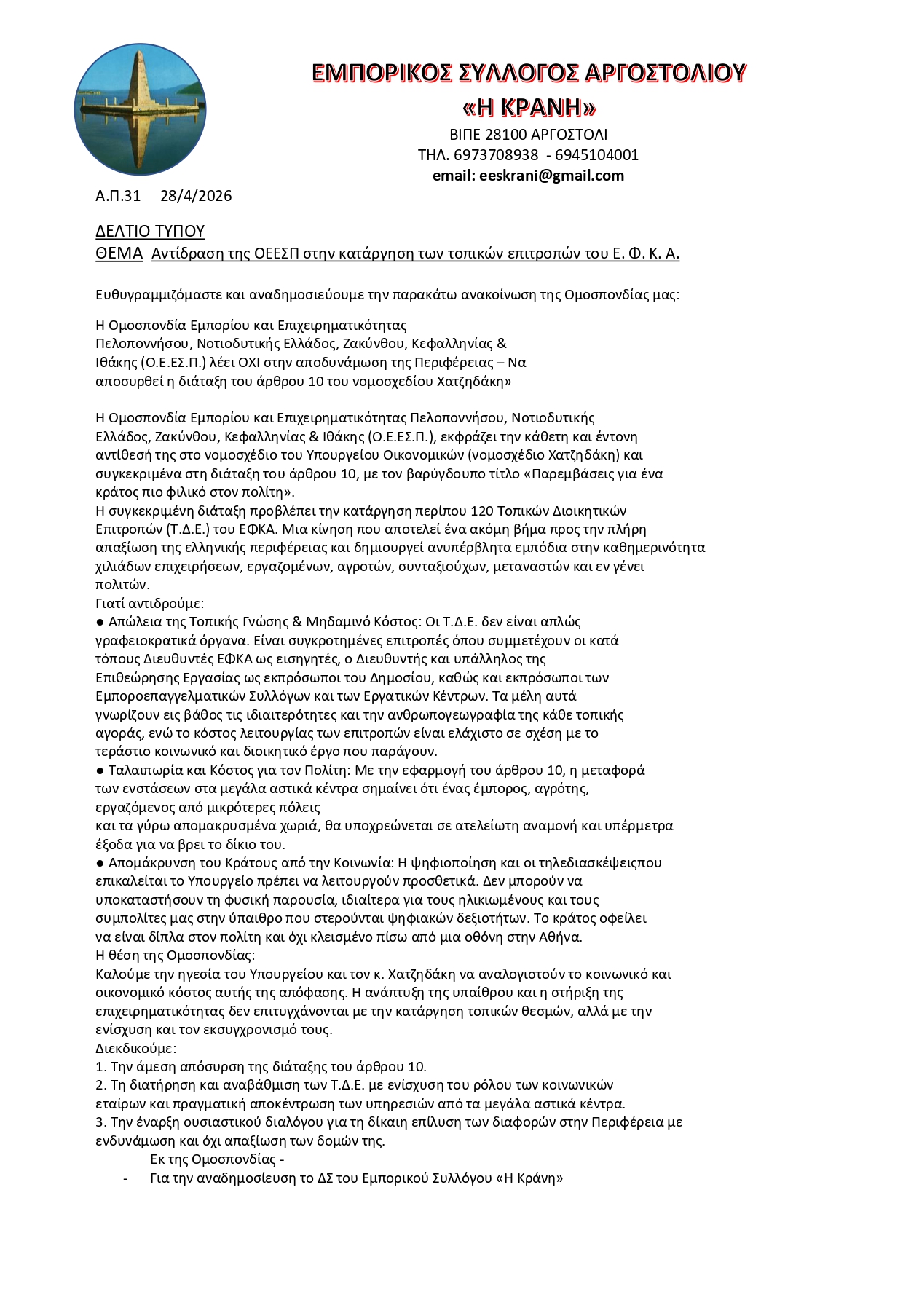 Αντίδραση της ΟΕΕΣΠ στην κατάργηση των τοπικών επιτροπών του Ε. Φ. Κ. Α.
