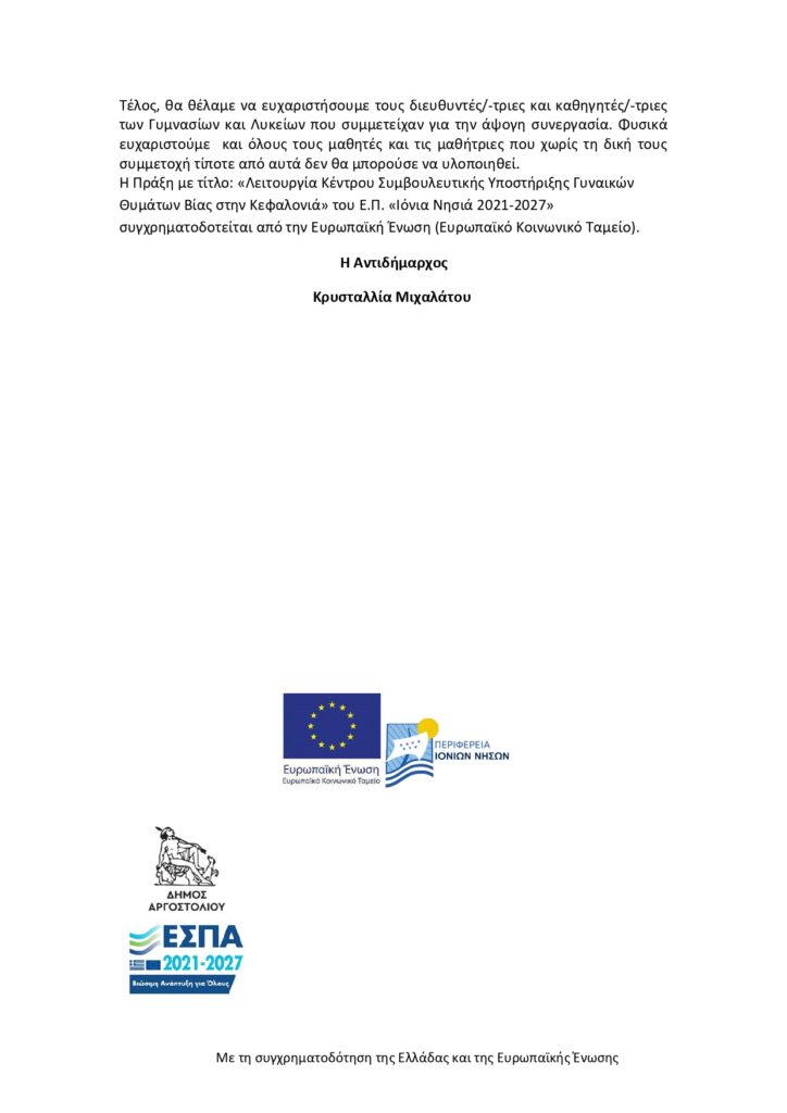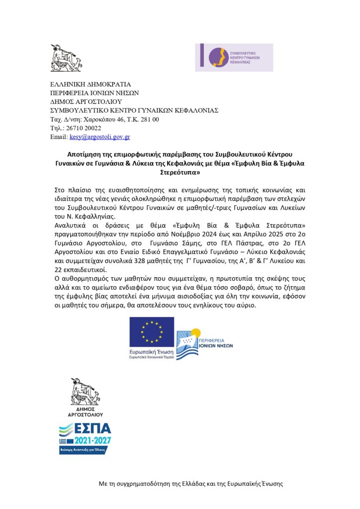 Αποτίμηση της επιμορφωτικής παρέμβασης του Συμβουλευτικού Κέντρου Γυναικών σε Γυμνάσια & Λύκεια της Κεφαλονιάς με θέμα «Έμφυλη Βία & Έμφυλα Στερεότυπα»
