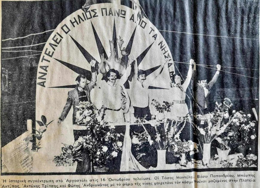 Η παρακάτω φωτογραφία είναι από την ιστορική εφημερίδα του τοπικού ΠΑΣΟΚ “Αλλαγή”, στη συγκέντρωση στο Αργοστόλι (16/10/1981) ,της ιστορικής νίκης του ΠΑΣΟΚ στις 18 Οκτωβρίου 1981