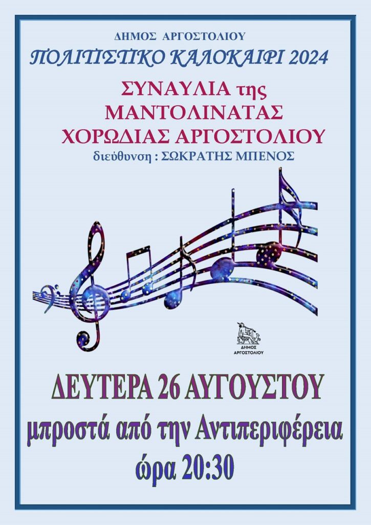 Απόψε στο Αργοστόλι μπροστά από την Αντιπεριφέρεια στις 8:30,  Συναυλία της Μαντολινάτας Χορωδίας Αργοστολίου υπό την διεύθυνση του Σωκράτη ΜπένουΟργάνωση Δήμος Αργοστολίου. Είσοδος ελεύθερη.
