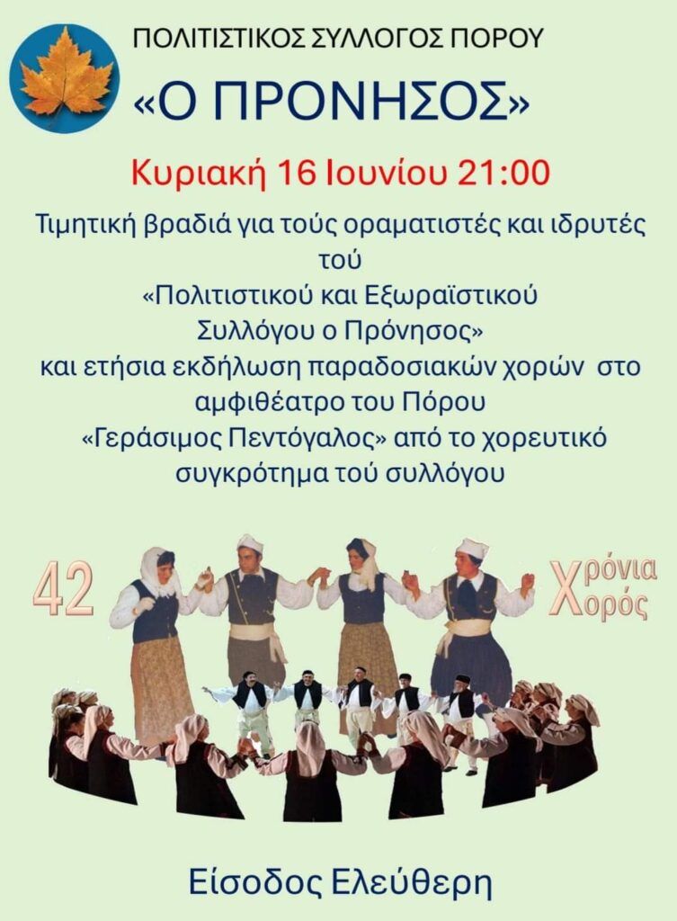 Απόψε στις 20:00 ξεκινά στον Πόρο η γιορταστική τιμητική εκδήλωση του πολιτιστικού συλλόγου!