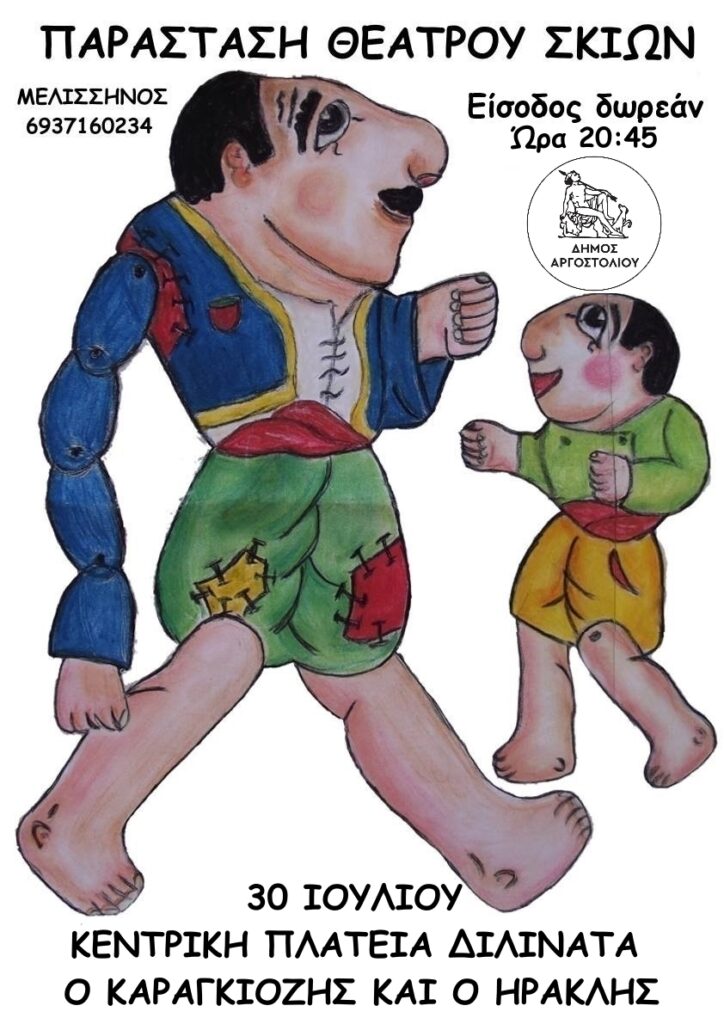 ΔΙΛΙΝΑΤΑ στην Κεντρική πλατεία, ώρα 20.45, ο Δήμος Αργοστολίου προσκαλεί τους μικρούς αλλά και τους μεγάλους φίλους του Καραγκιόζη, να διασκεδάσουν με την παράσταση Θεάτρου Σκιών «Ο ΚΑΡΑΓΚΙΟΖΗΣ & Ο ΗΡΑΚΛΗΣ» από τον Αλέξανδρο Μελισσηνό.
