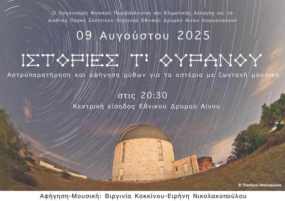 Η Κεφαλονιά υποδέχεται μια ξεχωριστή αστροβραδιά για μικρούς και μεγάλους, το Σάββατο 9 Αυγούστου 2025, με σημείο συνάντησης την κεντρική είσοδο του Εθνικού Δρυμού Αίνου στις 20:30.