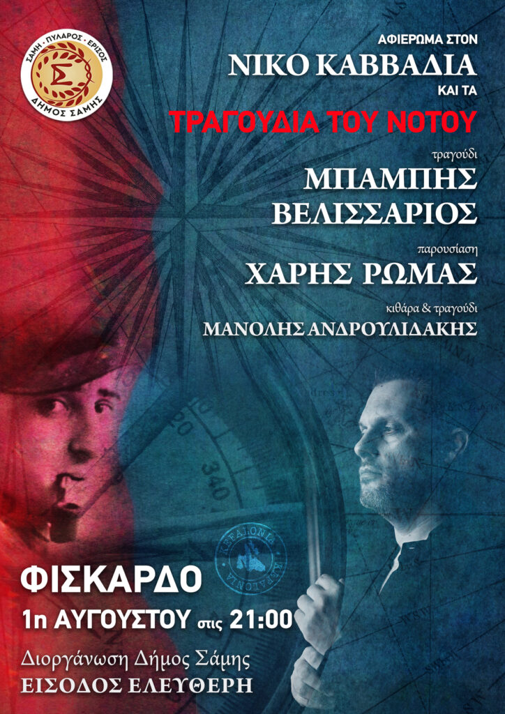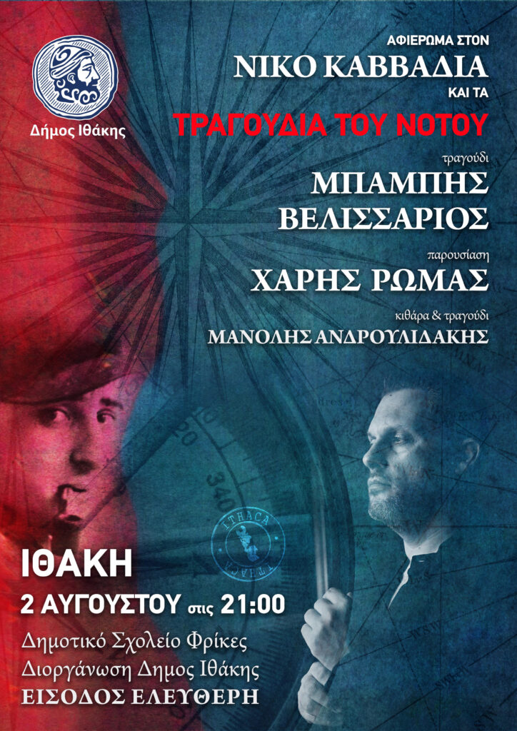 Ο Μπάμπης Βελισσάριος μας προσκαλεί την Παρασκευή 1η Αυγούστου στην Κεφαλονιά (Φισκάρδο) και το Σάββατο 2 Αυγούστου στην Ιθάκη (Φρίκες), σε ένα ταξίδι στα σπουδαία τραγούδια σε ποίηση του Νίκου Καββαδία! Τον ποιητή των μακρυσμένων ταξιδιών και των γαλάζιων πόντων, που φέτος συμπληρώνονται 50 χρόνια από τον θάνατό του.