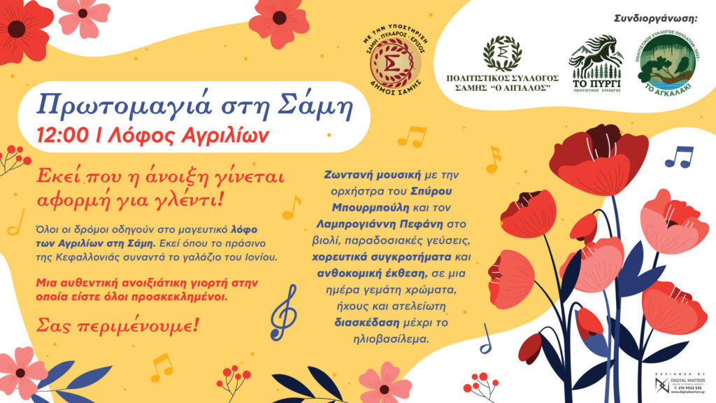 Οι Πολιτιστικοί Σύλλογοι Σάμης “Ο Αιγιαλός”, Πυργίου “Το Πυργί” και Πουλάτων “Το Αγκαλάκι”, με την υποστήριξη του Δήμου Σάμης, έχουν ετοιμάσει μια αυθεντική ανοιξιάτικη γιορτή στην οποία είστε όλοι προσκεκλημένοι.