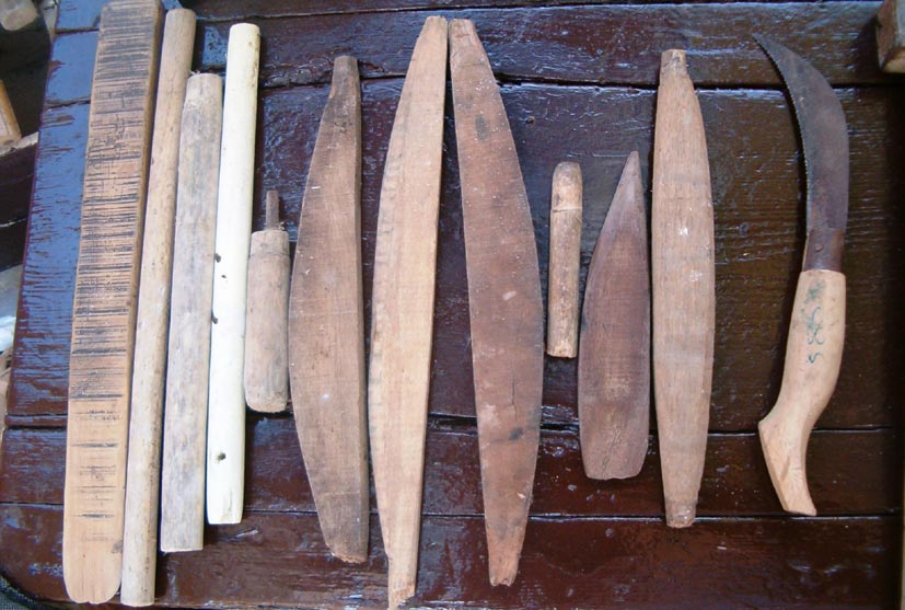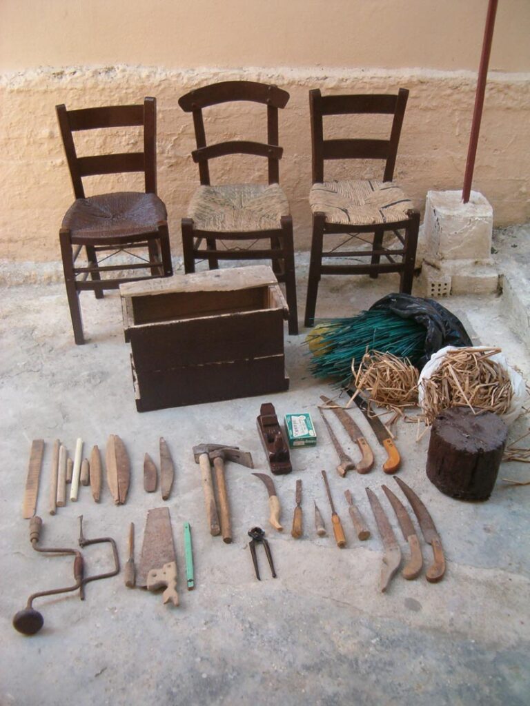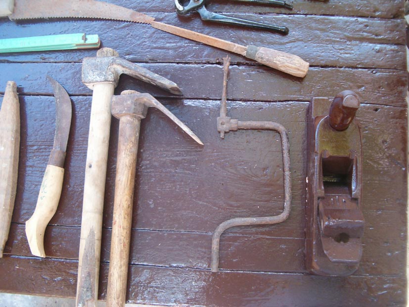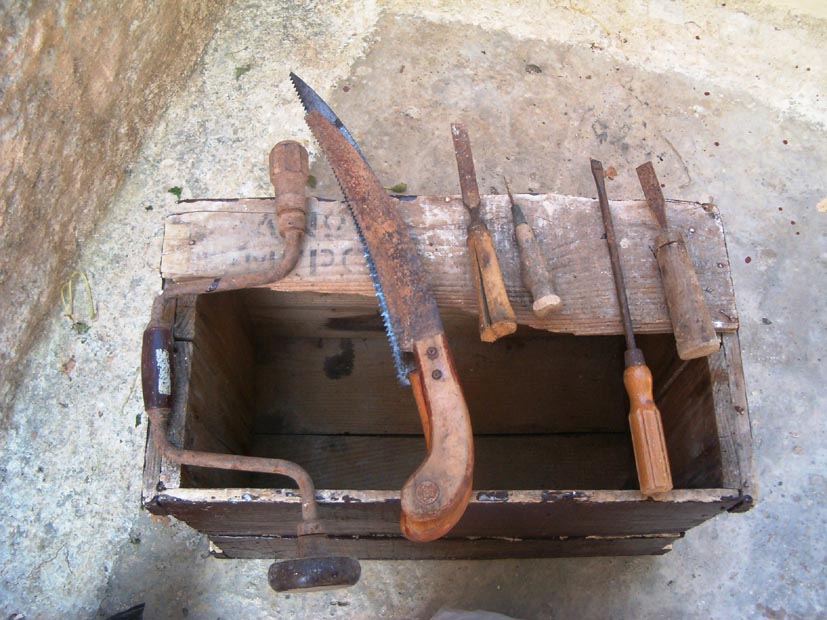 Σ’ ένα μεγάλο σακούλι κι άλλες φορές σε μία ξύλινη μικρομεσαία κασέλα, είχε μαζεμένα τα εργαλεία του. Πλάνες, ράσπες, σύρμα, σκερπάνι, φαλτσέτα, λίμες, καρφιά και άλλα εργαλεία, απαραίτητα για τη δουλειά του.