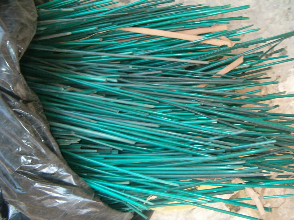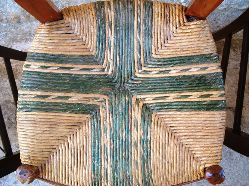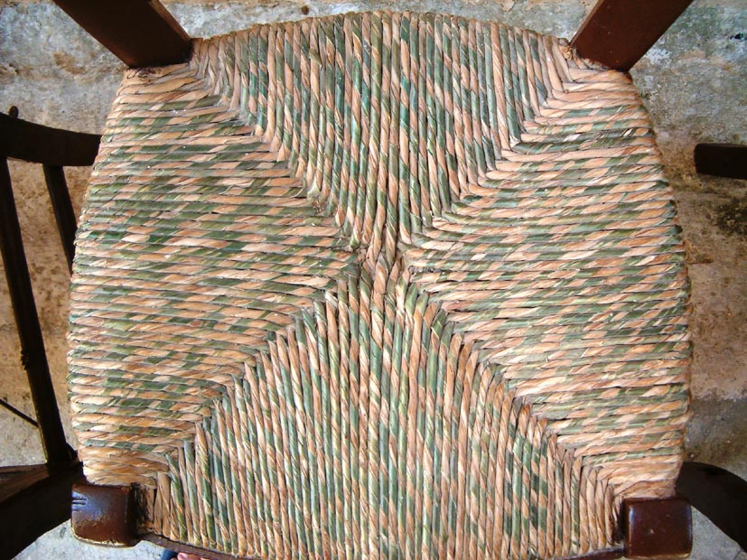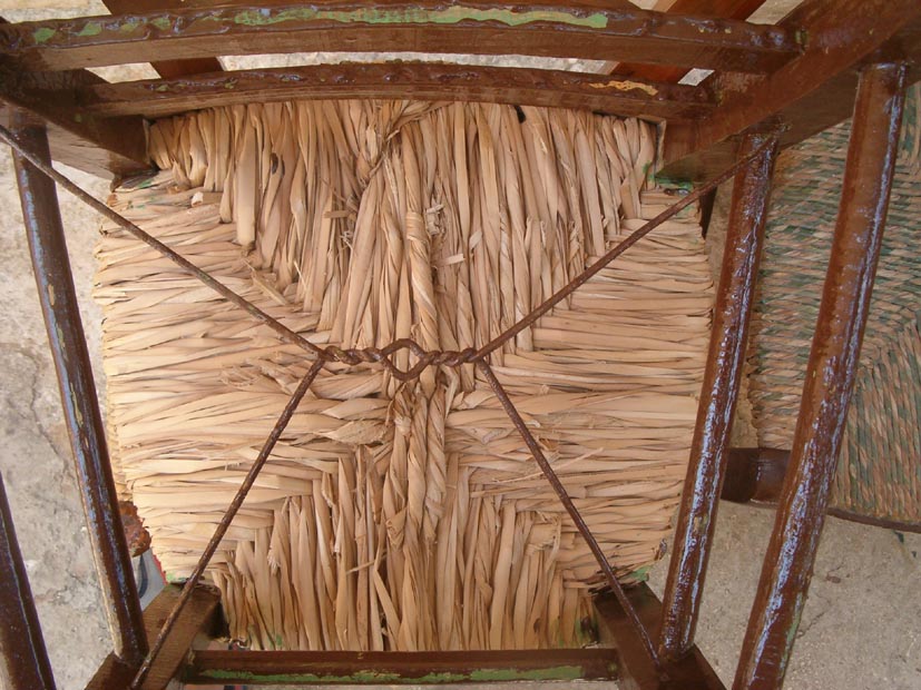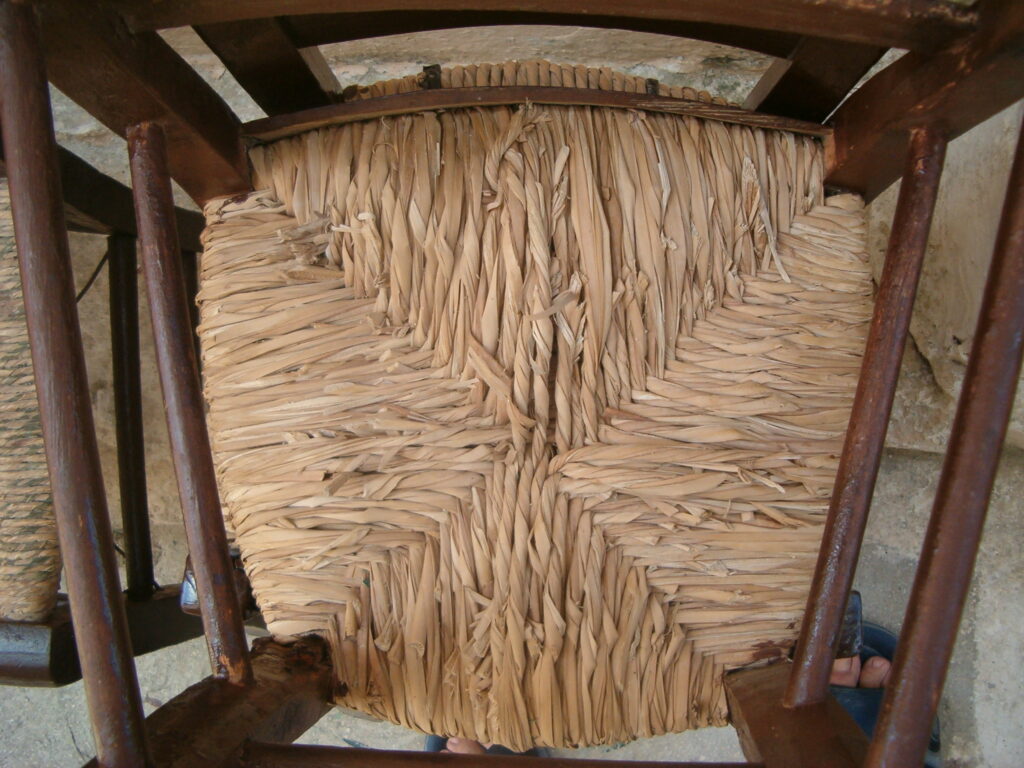 Το ψαθί όλο και το στριφογύριζε και έτσι τροφοδοτούσε ο Γεράσιμος Μηνιάτης την ψάθινη τριχιά. Είχε πάντα το νου του να είναι καλά μουσκεμένο, για να έχει ευλυγισία και να δουλεύεται καλά. Το τροφοδοτούσε ανελλιπώς για να «δένει» καλά, κομμάτι – κομμάτι. Με τον τρόπο αυτόν, από τον πρώτο κόμπο το ψαθί ήταν ένα συνεχόμενο σκοινί. Πολλές φορές, εκεί που έστριβε το ψαθί, τύλιγε γύρω του μια λεπτή ψάθινη χρωματιστή ταινία για να κοσμήσει το κάθισμα. Θυμάμαι, ότι είχε και πολύχρωμες τέτοιες ταινίες, που ήταν νάιλον σωληνάκι και σωληνάκι πλακέ, καθώς και λεπτά μικρά βούρλα ή καλαμάκια, τα οποία χρησιμοποιούνταν για να διακοσμηθεί η καρέκλα.
