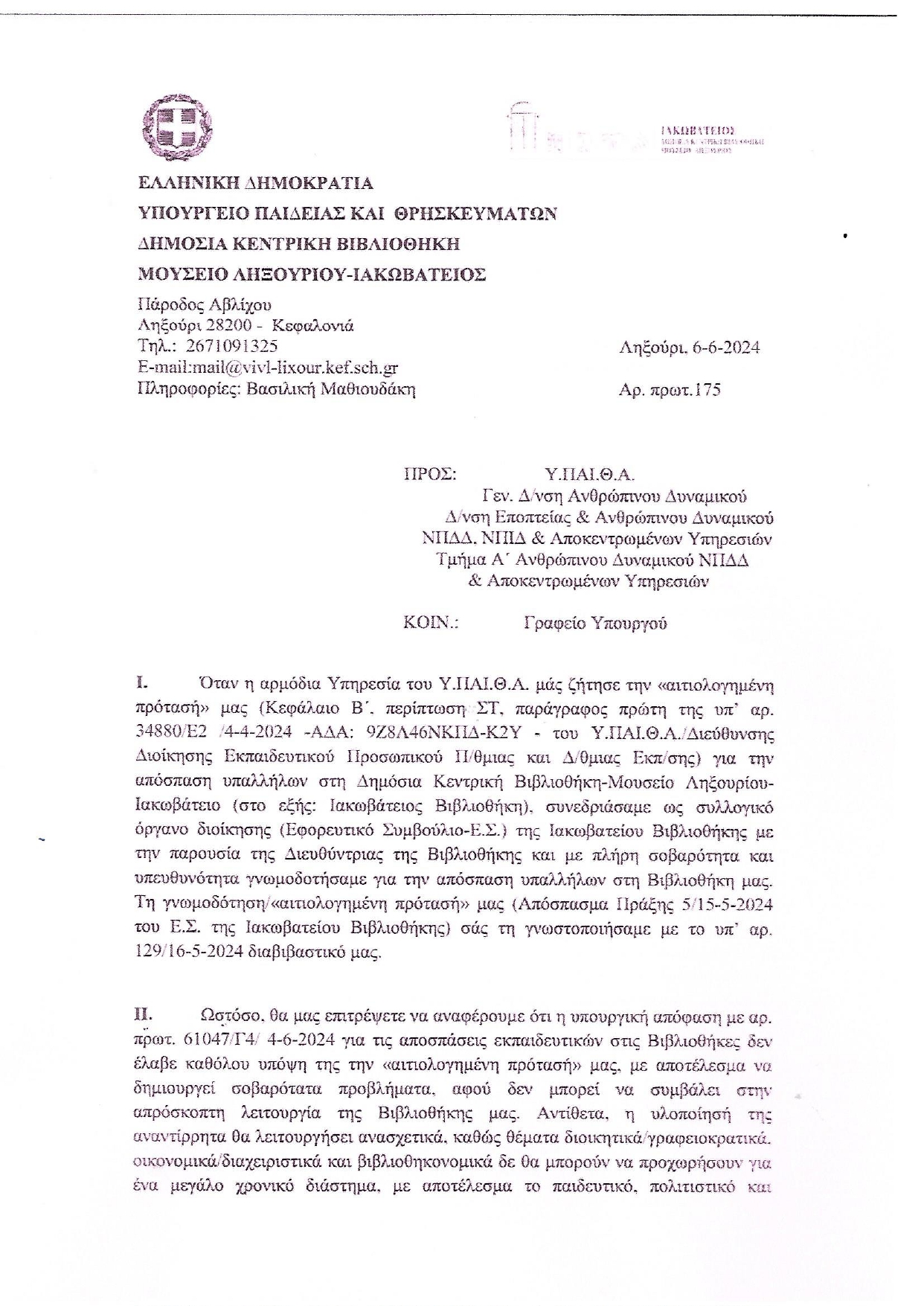 Για την απόσπαση της υπαλλήλου της Ιακωβατείου Βιβλιοθήκης